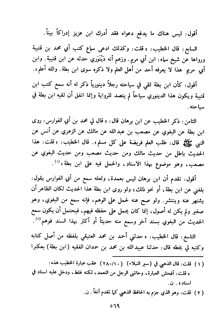 الثامن: ذكر الخطيب عن ابن برهان قال: «قال لي محمد بن أبي الفوارس: روى ابن بطة عن البغوي عن مصعب بن عبد الله عن مالك عن الزهري عن أنس عن النبي صلى الله عليه وسلم قال: طلب العلم فريضة على كل مسلم» . قال الخطيب: «قلت: هذا الحديث باطل من حديث مالك ومن حديث مصعب ومن حديث البغوي عن مصعب وهو موضوع بهذا الإسناد والحمل فيه على ابن بطة» . (1)
