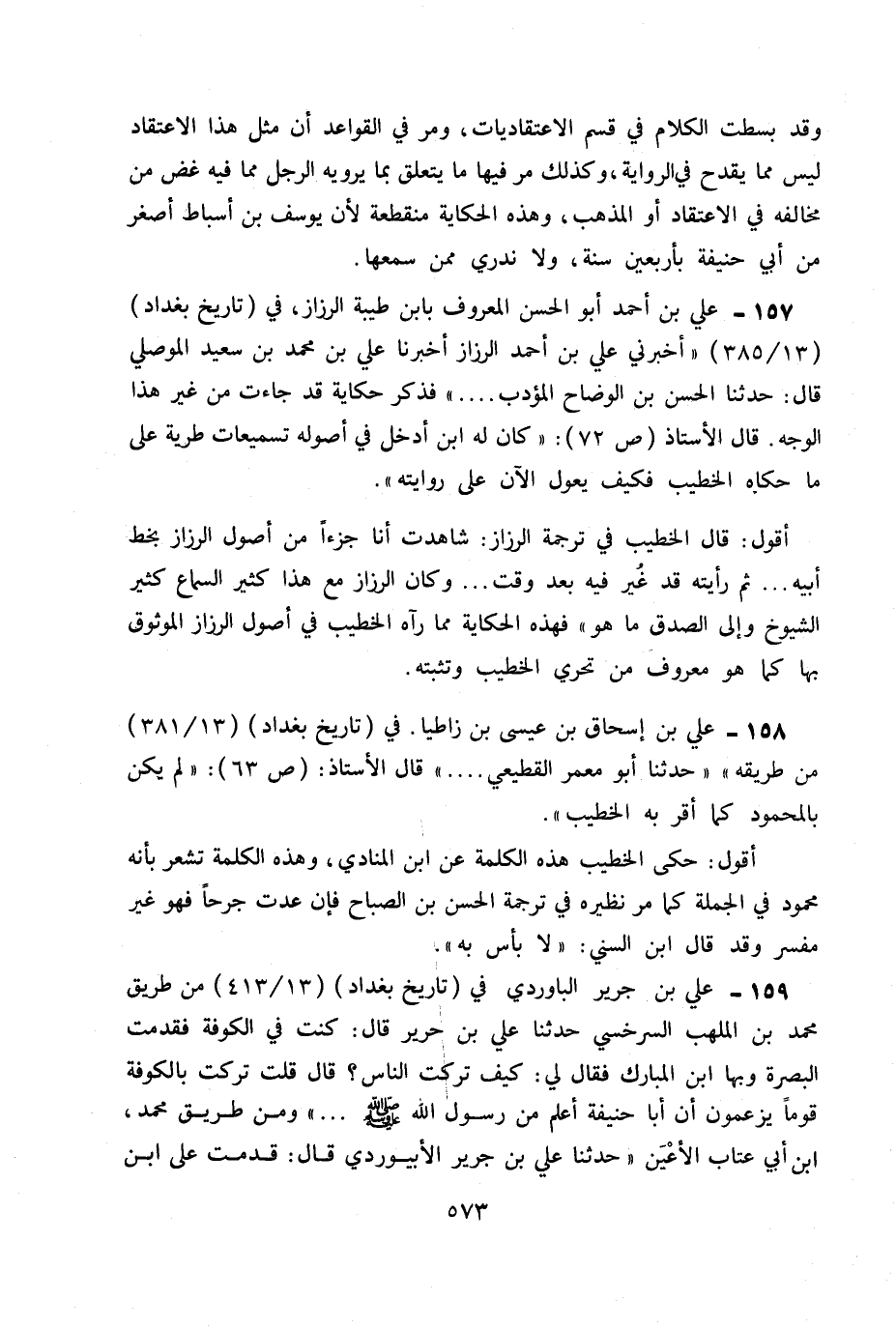 158- علي بن إسحاق بن عيسى بن زاطيا. في (تاريخ بغداد) 13 / 381 من طريقه «حدثنا أبو معمر القطيعي ... .» قال الأستاذ: ص 63 «لم يكن بالمحمود كما أقر به الخطيب» .