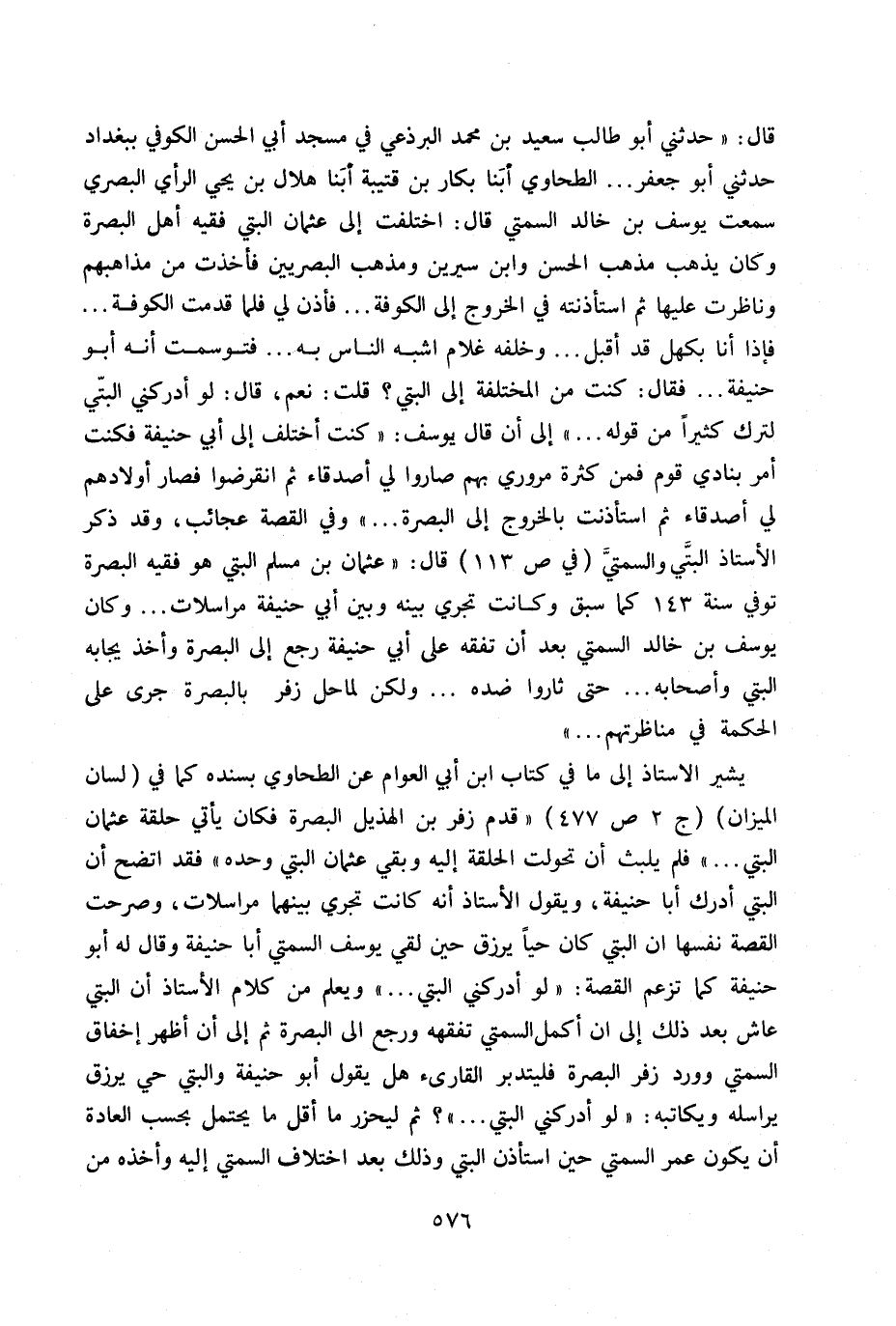 قال: «حدثني أبو طالب سعيد بن محمد البرذعي بن قتيبة أبنا هلال بن يحيى الرأي البصري سمعت يوسف بن خالد السمتي قال: اختلفت إلى عثمان البتي فقيه أهل البصرة وكان يذهب مذهب الحسن وابن سيرين ومذهب البصريين فأخذت من مذاهبهم وناظرت عليها ثم استأذنته في الخروج إلى الكوفة ... فأذن لي فلما قدمت الموفية ... فإذا أنا بكهل قد أقبل ... وخلفه غلام أشبه الناس به ... فتوسمت أنه أبو حنيفة ... فقال: كنت من المختلفة إلى البتي؟ قلت: نعم، قال: لو أدركني البتي لترك كثيراً من قوله ... » إلى أن قال يوسف: «كنت أختلف إلى أبي حنيفة فكنت أمر بنادي قوم فمن كثرة مروري بهم صاروا لي أصدقاء ثم انقرضوا فصار أولادهم لي أصدقاء ثم استأذنت بالخروج إلى البصرة ... » وفي القصة عجائب. وقد ذكر الأستاذ البتي والسمتي في ص 113 قال: «عثمان بن مسلم البتي هو فقيه البصرة توفي سنة 143 كما سبق وكانت تجري بينه وبين أبي حنيفة مراسلات ... وكان يوسف بن خالد السمتي بعد أن تفقه على أبي حنيفة رجع إلى البصرة وأخذ يجابه البتي وأصحابه ... حتى ثاروا ضده ... ولكن لما حل زفر بالبصرة جرى على الحكمة في مناظرتهم ... » .