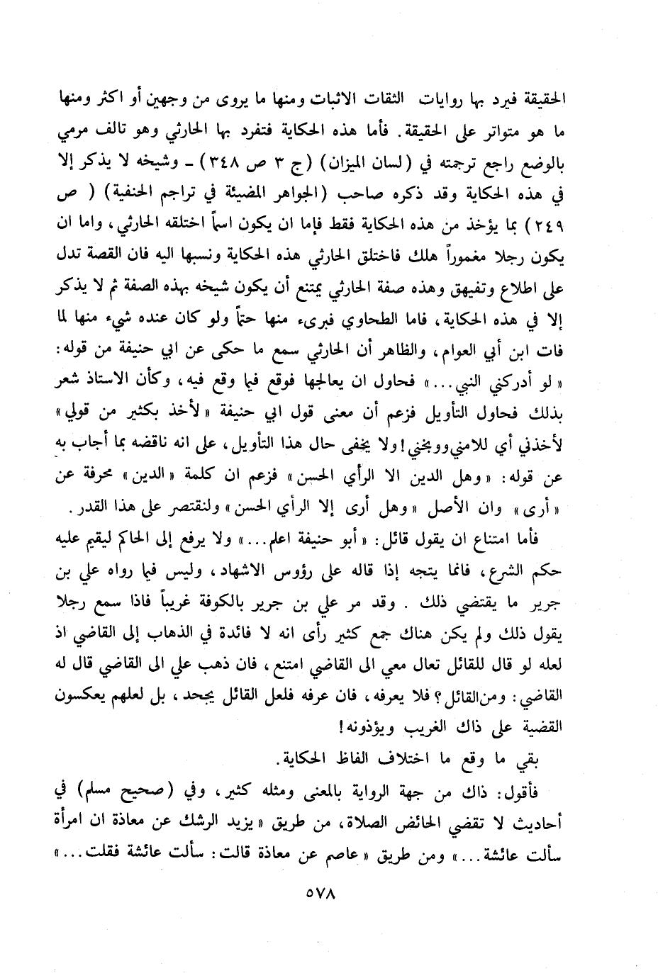 الحقيقة فيرد بها روايات الثقات الأثبات ومنها ما يروى من وجهين أو أكثر ومنها ما هو متواتر على الحقيقة فأما هذه الحكاية فتفرد بها الحارثي وهو تالف مرمي بالوضع راجع ترجمته في (لسان الميزان) ج 3 ص 348 - وشيخه لا يذكر إلا في هذه الحكاية وقد ذكره صاحب (الجواهر المضيئة في تراجم الحنفية) ص 249 بما يؤخذ من هذه الحكاية فقط فإما أن يكون اسماً اختلقه الحارثي، وإما أن يكون رجلاً مغموراً هلك فاختلق الحارثي هذه الحكاية ونسبها إليه فإن القصة تدل على اطلاع وتفيهق وهذه صفة الحارثي يمتنع أن يكون شيخه بهذه الصفة ثم لا يذكر إلا في هذه الحكاية، فأما الطحاوي فبريء منها حتماً ولو كان عنده شيء منها لما فات ابن أبي العوام. والظاهر أن الحارثي سمع ما حكى عن أبي حنيفة من قوله: «لو أدركني النبي ... » فحاول أن يعالجها فوقع فيه. وكأن الأستاذ شعر بذلك فحاول التأويل فزعم أن معنى قول أبي حنيفة «لأخذ بكثير من قولي» لأخذني أي للامني ووبخني! ولا يخفى حال هذا التأويل، على أنه ناقصة بما أجاب به عن قوله: «وهل الدين إلا الرأي الحسن» فزعم أن كلمة «الدين» محرفة عن «أرى» وأن الأصل «وهل أرى إلا الرأي الحسن» ولنقتصر على هذا القدر.