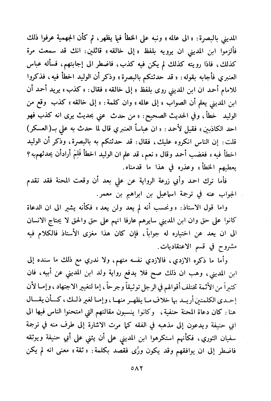فأما ترك أحمد وأبي زرعة الرواية عن علي بعد أن وقعت المحنة فقد تقدم الجواب عنه في ترجمة إسماعيل بن إبراهيم بن معمر. وأما قول الأستاذ: «ونحسب أنه لم يعد ولن يعد» فكأنه يشير إلى أن الدعاة كانوا على حق وأن ابن المديني سايرهم عارفاً أنهم على حق والحق لا يحتاج الإنسان إلى أن يعد عن اختياره له جواباً. فإن كان هذا مغزى الأستاذ فالكلام فيه مشروح في قسم الاعتقاديات.