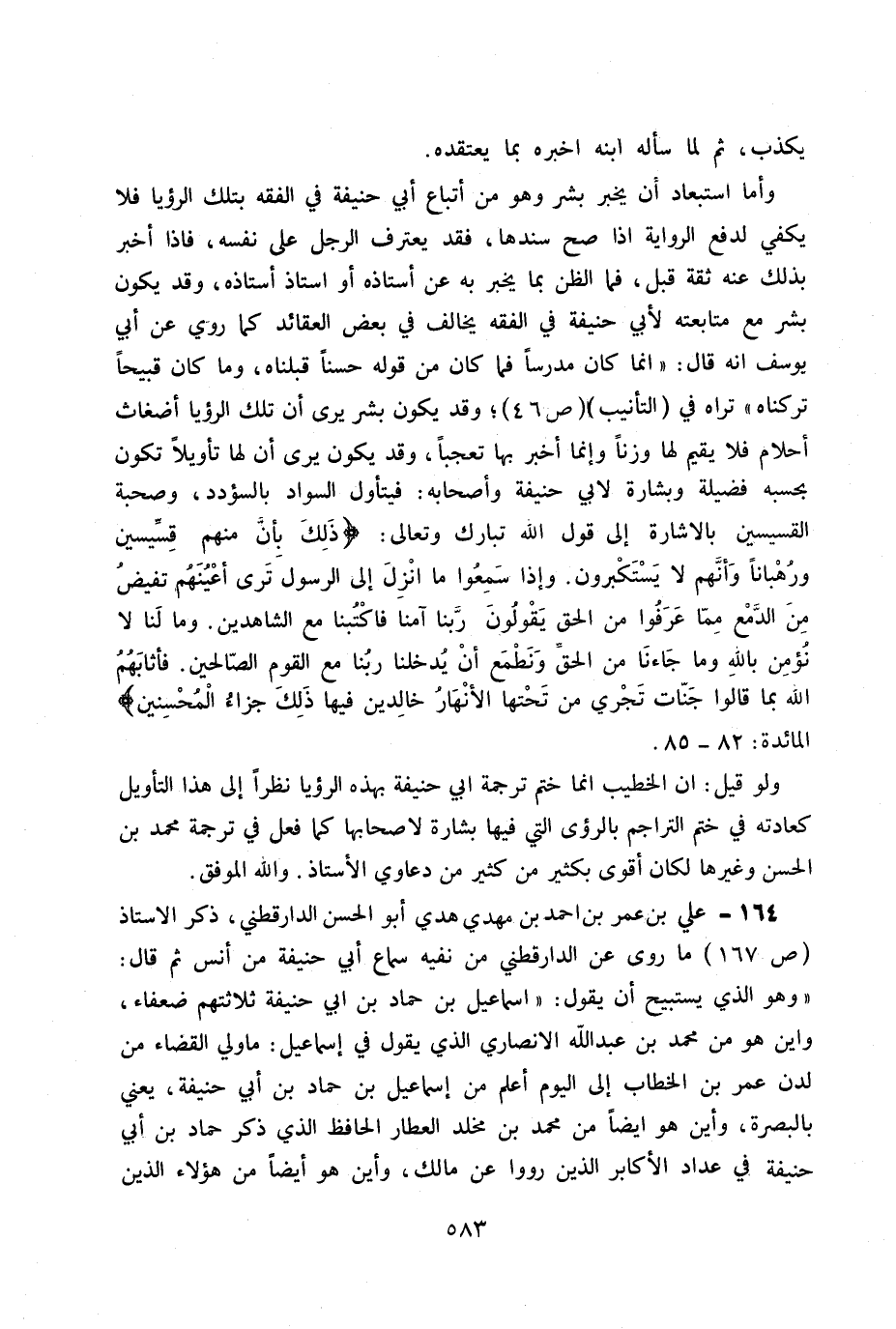 164- علي بن عمر بن أحمد بن مهدي أبو الحسن الدارقطني. ذكر الأستاذ ص 167 ما روي عن الدارقطني من نفيه سماع أبي حنيفة من أنس ثم قال: «وهو الذي يستبيح أن يقول: إسماعيل بن حماد بن أبي حنيفة ثلاثتهم ضعفاء. وأين هو من محمد بن عبد الله الأنصاري الذي يقول في إسماعيل: ما ولي القضاء من لدن عمر بن الخطاب إلى اليوم أعلم من إسماعيل بن حماد بن أبي حنيفة. يعني بالبصرة. وأين هو أيضاً من محمد بن مخلد العطار الحافظ الذي ذكر حماد بن أبي حنيفة في عداد الأكابر الذين رووا عن مالك. وأين هو أيضاً من هؤلاء الذين