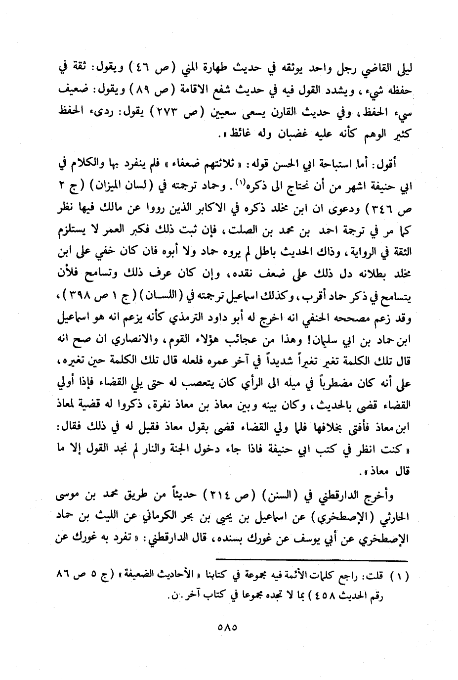 أقول: أما استباحة أبي الحسن قوله: «ثلاثتهم ضعفاء» فلم ينفرد بها والكلام في أبي حنيفة أشهر من أن نحتاج إلى ذكره (1) . وحماد ترجمته في (لسان الميزان) ج2 ص 346 ودعوى أن ابن مخلد ذكره في الأكابر الذين رووا عن مالك فيها نظر كما مر في ترجمة أحمد بن محمد بن الصلت، فإن ثبت ذلك فكبر العمر لا يستلزم الثقة في الرواية، وذاك الحديث باطل لم يروه حماد ولا أبوه فإن كان خفي على ابن مخلد بطلانه دل ذلك على ضعف نقده، وإن كان عرف ذلك وتسامح فلأن يتسامح في ذكر حماد أقرب. وكذلك إسماعيل ترجمته في (اللسان) ج1 ص 398. وقد زعم مصححه الحنفي أنه أخرج له أبو داود والترمذي كأنه يزعم أنه هو إسماعيل بن حماد بن أبي سليمان! وهذا من عجائب هؤلاء القوم، والأنصاري إن صح أنه قال تلك الكلمة تغير تغيراً شديداً في آخر عمره فلعله قال تلك الكلمة حين تغيره، على أنه كان مضطرباً في ميله إلى الرأي كان يتعصب له حتى يلي القضاء فإذا أو لي القضاء قضى بالحديث، وكان بينه وبين معاذ بن معاذ نفرة، ذكروا له قضية لمعاذ بن معاذ فأفتى بخلافها فلما ولي القضاء قضى بقول معاذ فقيل له في ذلك فقال: «كنت أنظر في كتب أبي حنيفة فإذا جاء دخول الجنة والنار لم نجد القول إلا ما قال معاذ» .