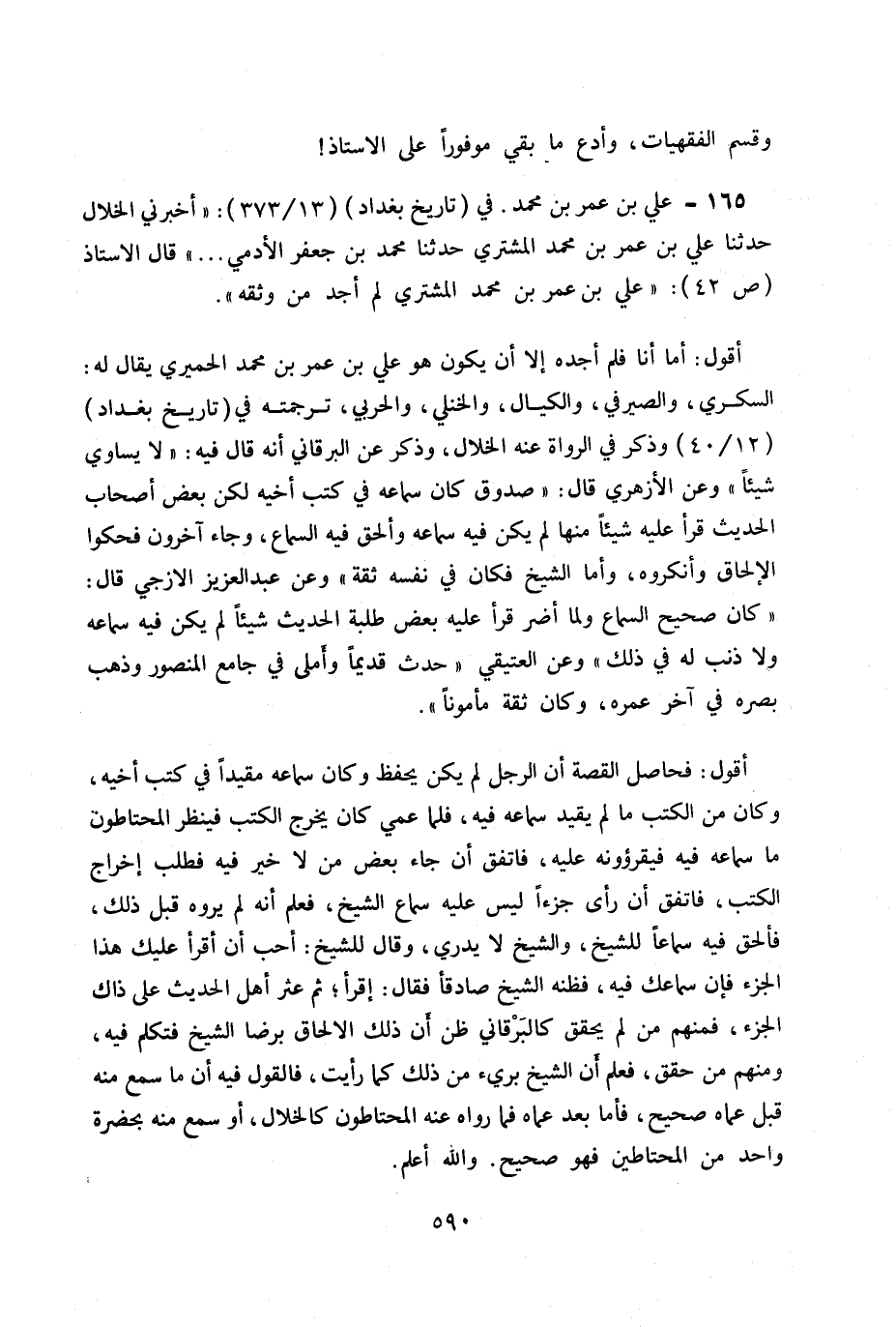 165- على بن عمر بن محمد. في (تاريخ بغداد) (13/373) : «أخبرني الخلال حدثنا على بن عمر بن محمد المشتري حدثنا محمد بن جعفر الأدمي ... » قال الأستاذ ص 42: «علي بن عمر بن محمد المشتري لم أجد من وثقه» .