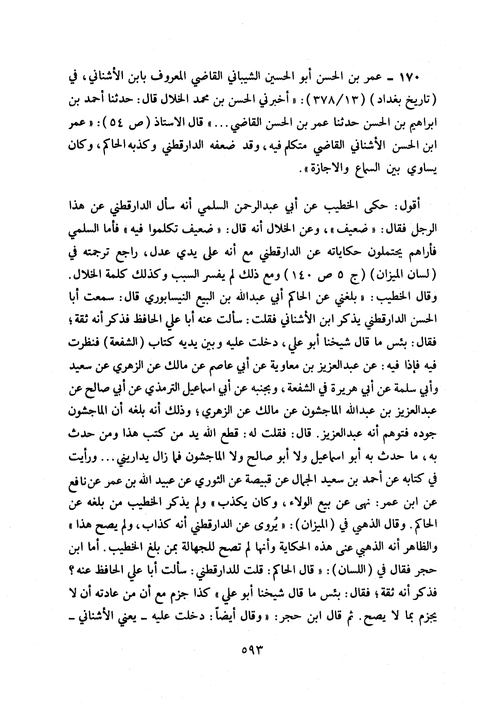 170- عمر بن الحسن أبو الحسين الشيباني القاضي المعروف بابن الأشناني. في (تاريخ بغداد) 13/378: «أخبرني الحسن بن محمد الخلال قال: حدثنا أحمد بن إبراهيم بن الحسن حدثنا عمر بن الحسن القاضي ... » قال الأستاذ ص 54: «عمر بن الحسن الأشناني القاضي متكلم فيه وقد ضعفه الدارقطني وكذبه الحاكم وكان يساوي بين السماع الإجازة» .