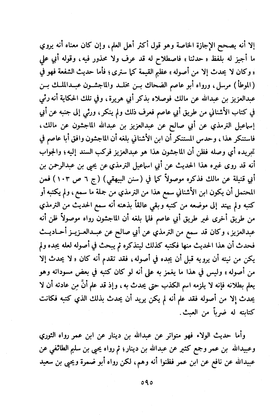 إلا أنه يصحح الإجازة الخاصة وهو قول أكثر أهل العلم وإن كان معناه أنه يروي ما أجيز له بلفظ «حدثنا» فاصطلاح له قد عرف ولا محذور فيه، وقوله أبي علي «وكان لا يحدث إلا من أصوله» عظيم القيمة كما سترى؛ فأما حديث الشفعة فهو في (الموطأ) مرسل، ورواه أبو عاصم الضحاك بن مخلد والماجشون عبد الملك بن عبد العزيز بن عبد الله عن مالك فوصلاه بذكر أبي هريرة، وفي تلك الحكاية أنه رئي في كتاب الأشناني من طريق أبي عاصم فعرف ذلك ولم ينكر، ورئي إلى جنبه عن أبي إسماعيل الترمذي عن أبي صالح عن عبد العزيز بن عبد الله الماجشون عن مالك، فاستنكر هذا، وحدس المستنكر أن ابن الأشناني بلغه أن الماجشون وافق أبا عاصم في تجويده أي وصله فظن أن الماجشون هذا هو عبد العزيز فركب السند إليه. والجواب أنه قد روى غيره هذا الحديث عن أبي إسماعيل الترمذي عن يحيى بن عبد الرحمن بن أبي قتيلة عن مالك فذكره موصولاً كما في (سنن البيهقي) ج6ص103 فمن المحتمل أن يكون ابن الأشناني سمع هذا من الترمذي في جملة ما سمع، ولم يكتبه أو كتبه ولم يهتد إلى موضعه من كتبه وبقى عالقاً بذهنه أنه سمع الحديث من الترمذي من الطريق أخرى غير طريق أبي عاصم فلما بلغه أن الماجشون رواه موصولاً ظن أنه عبد العزيز وكان قد سمع من الترمذي عن أبي صالح عن عبد العزيز أحاديث فحدس هذا الحديث منها فكتبه كذلك ليتذكره ثم يبحث في أصوله لعله يجده ولم يكن من نيته أن يرويه قبل أن يجده في أصوله، فقد تقدم أنه كان «لا يحدث إلا من أصوله» وليس في هذا ما يغمز به عل أنه لو كان كتبه في بعض مسوداته وهو يعلم بطلانه فإنه لا يلزمه اسم الكذب حتى يحدث به، وإذا علم بأن من عادته أن لا يحدث إلا من أصوله فقد علم أنه لم يكن يريد أن يحدث بذلك الذي كتبه فكانت كتابته له ضرباً من العبث.