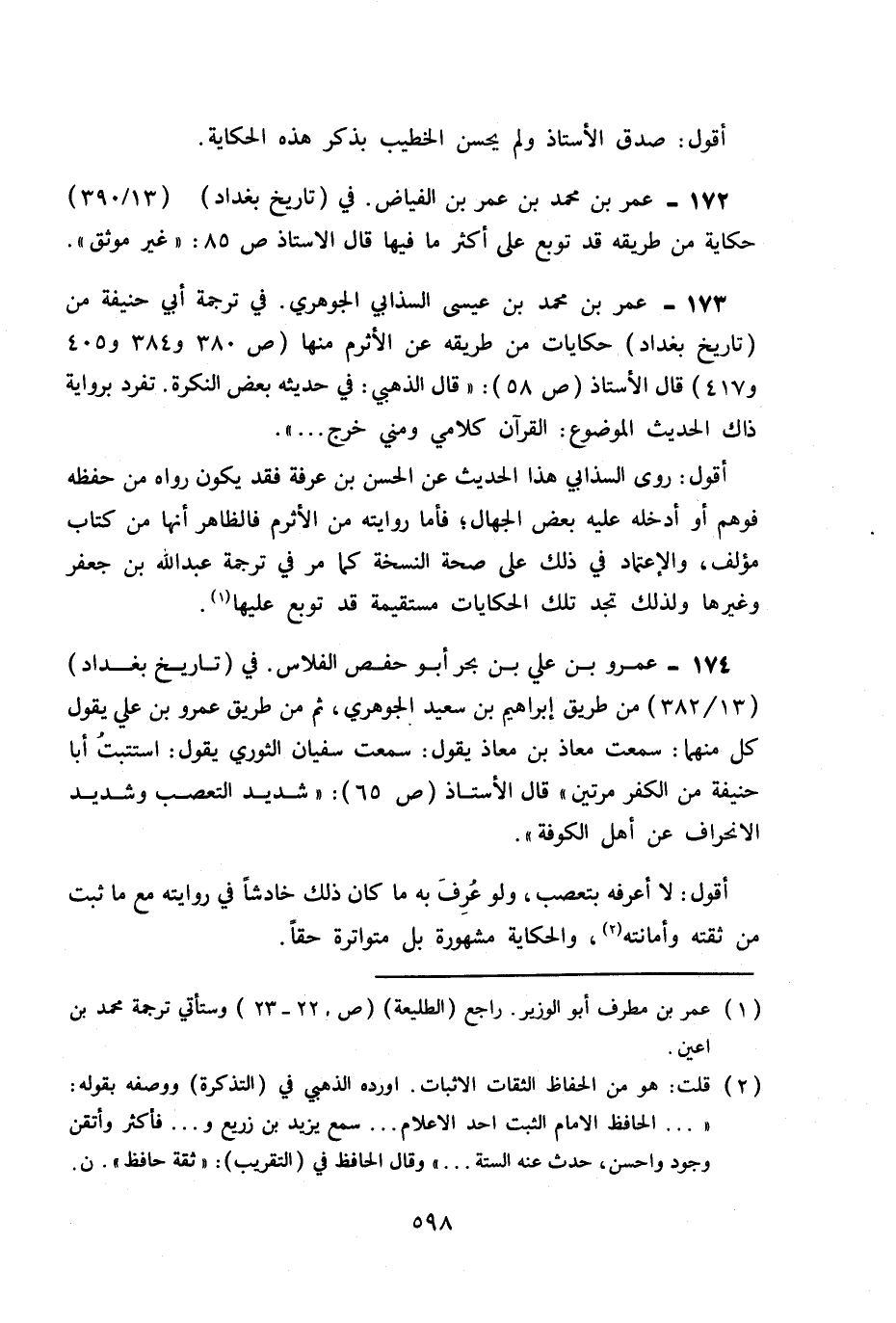 174- عمر بن علي بن البحر أبو حفص الفلاس. في (تاريخ بغداد) 13/382 من طريق إبراهيم عن سعيد الجوهري، ثم من طريق عمر بن علي يقول كل منهما: سمعت معاذ بن معاذ يقول: سمعت سفيان الثوري يقول: استتبت أبا حنيفة من الكفر مرتين» قال الأستاذ ص 65: «شديد التعصب وشديد الانحراف عن أهل الكوفة» .