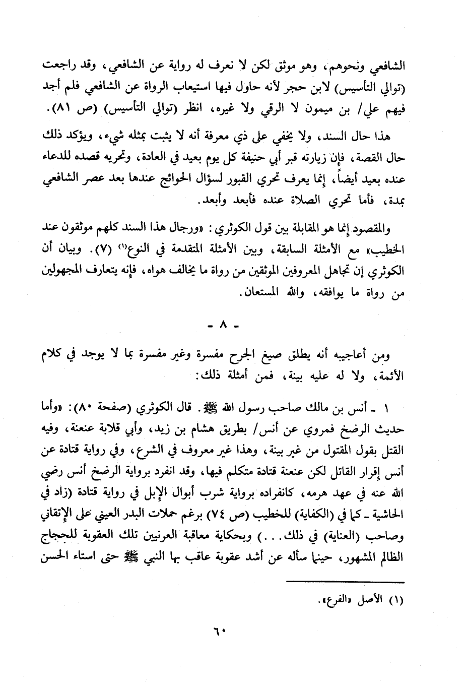 والمقصود إنما هو المقابلة بين قول الكوثري «ورجال هذا السند كلهم موثقون عند الخطيب» مع الأمثلة السابقة، وبين الأمثلة المتقدمة في النوع (1) (7) . وبيان أن الكوثري إن تجاهل المعروفين الموثقين من رواة ما يخالف هواه، فإنه يتعارف المجهولين من رواة ما يوافقه، والله المستعان.