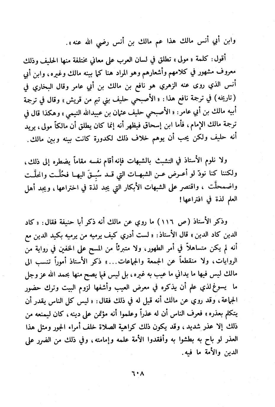 وذكر الأستاذ ص 116 ما روي عن مالك أنه ذكر أبا حنيفة فقال: «كاد الدين كاد الدين» قال الأستاذ (لست أدري كيف يرميه من يرميه بكيد الدين مع أنه لم يكن متساهلا في أمر الطهو ر ولا متبرئا من المسح على الخفين في رواية من الراويات ولا منقطعا عن الجمعة والجماعات ... .» ذكر الأستاذ أمورا تنسب إلى مالك ليس فيها ما يداني ما عيب به غيره بل ليس فيما يصح منها بحمد الله عز وجل ما يسوغ الذي علم أن يذكره في معرض العيب وأشفها لزوم البيت وترك حضور الجماعة وقد روي عن مالك أنه قيل له في ذلك فقال: «ليس كل الناس يقدر أن يتكلم بعذره» فعرف الناس أن له عذرا وعلموا أنه مؤتمن على دينه ما كان ليمنعه من ذلك إلا عذر شديد وقد يكون ذلك كراهية الصلاة خلف أمراء الجور ومثل هذا العذر لو باح به بطشوا به وأفقدوا الأمة علمه وإمامته وفي ذلك من الضرر على الدين والأمة ما فيه.