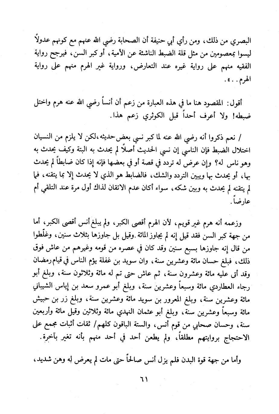 وزعمه أنه هرم غير قويم، لأن الهرم أقصى الكبر، ولم يبلغ أنس أقصى الكبر، أما من جهة كبر السن فقد قيل إنه لم يجاوز المائة وقيل بل جاوزها بثلاث سنين، وغلّطوا من قال إنه جاوزها بسبع سنين وقد كان في عصره من قومه وغيرهم من عاش فوق ذلك، فبلغ حسان مائة وعشرين سنة، وكان سويد بن غفلة يؤم الناس في قيام رمضان وقد أتى عليه مائة وعشرون سنة، ثم عاش حتى تم له مائة وثلاثون سنه، وبلغ أبو رجاء العطاردي مائة وسبعاً وعشرين سنه، وبلغ أبو عمرو سعد بن إياس الشيباني مائة وعشرين سنة، وبلغ المعرور بن سويد مائة وعشرين سنة، وبلغ زر بن حبيش مائة وسبعاً وعشرين سنة، وبلغ أبو عثمان النهدي مائة وثلاثين وقيل مائة وأربعين سنة، وحسان صحأبي من قوم أنس، والستة الباقون كلهم ثقات أثبات مجمع على الاحتجاج بروايتهم مطلقاً، ولم يطعن أحد في أحد منهم بأنه تغير بأخرة. وأما من جهة قوة البدن فلم يزل أنس صالحاً حتى مات لم يعرض له وهن شديد،