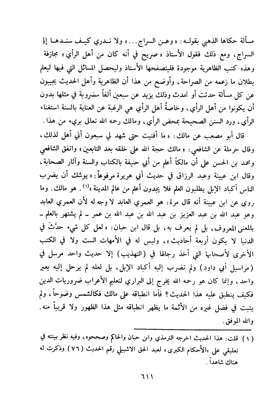 وليس له في الأمهات الست ولا في الكتب الأخرى لأصحابها التي أخذ رجالها في (التهذيب) إلا حديث واحد مرسل في (مراسيل أبي داود) ولم تضرب إليه أكباد الإبل بل لعله لم يرحل إليه بعير واحد وإنما كان هو رحمه الله يخرج إلى البراري لتعليم الأعراب ضروريات الدين فكيف ينطبق عليه هذا الحديث؟ فأما انطباقه على مالك فكالشمس وضوحا ولم يثبت في فضل غيره من الأئمة ما يظهر انطباقه مثل هذا الظهور ولا قريبا منه. والله الموفق.