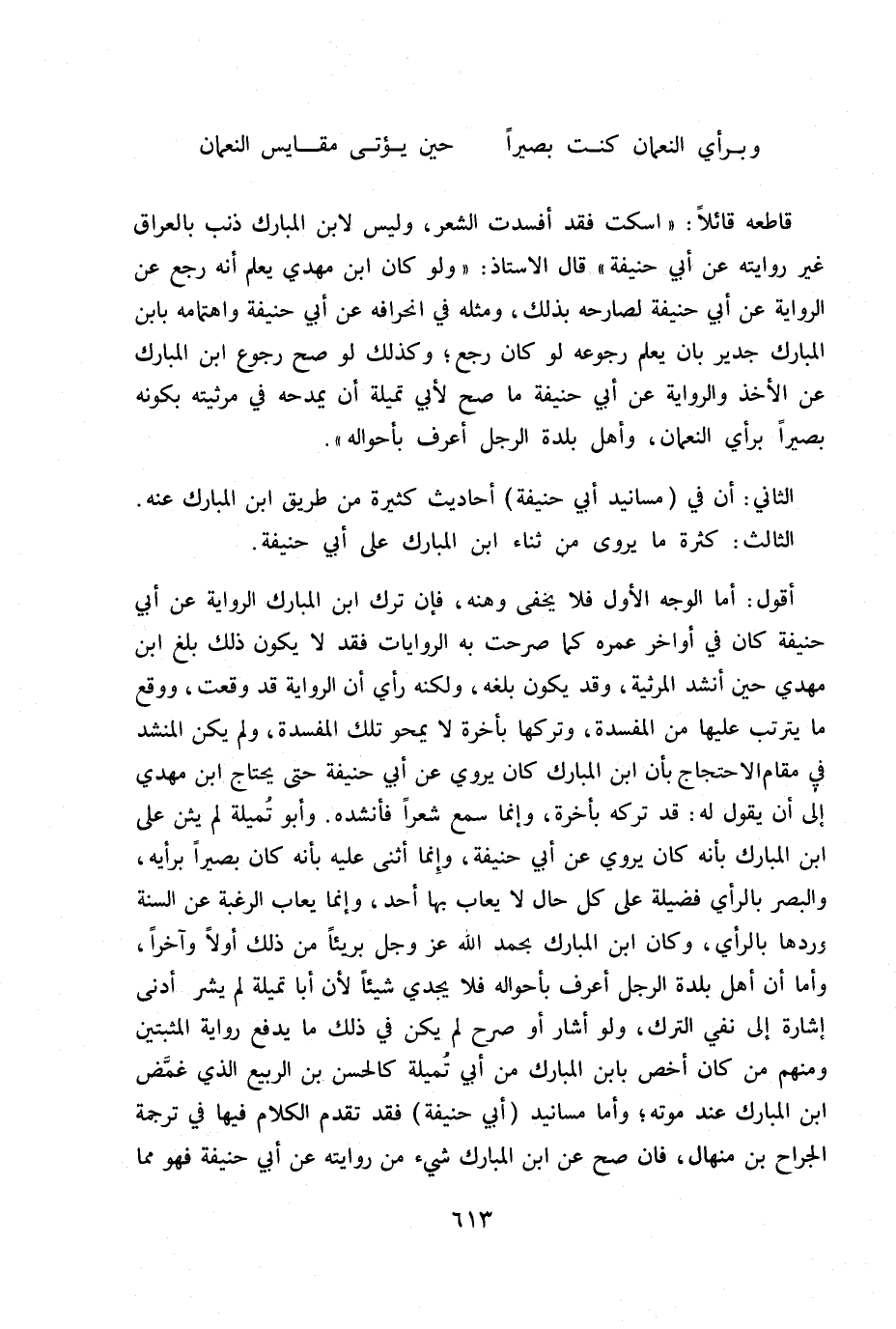 قاطعة قائلا: «أسكت فقد أفسدت الشعر وليس لابن المبارك ذنب بالعراق غير روايته عن أبي حنيفة» قال الأستاذ: «ولو كان ابن مهدي يعلم أنه رجع عن الرواية عن أبي حنيفة لصارحه بذلك ومثله في انحرافه عن أبي حنيفة واهتمامه بابن المبارك جدير بأن يعلم رجوعه لو كان رجع.
