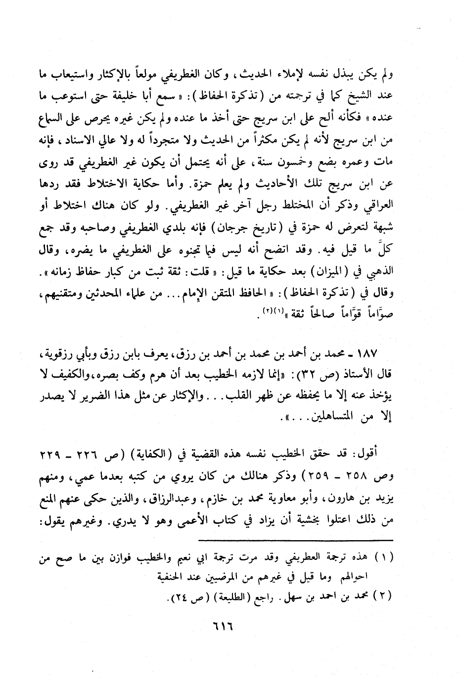 187- محمد بن أحمد بن محمد بن أحمد بن رزق يعرف بابن رزق وبأبي رزقويه. قال الأستاذ ص 32: «إنما لازمه الخطيب بعد أن هرم وكف بصره والكفيف لا يؤخذ عنه إلا ما يحفظه عن ظهر القلب ... والإكثار عن مثل هذا الضرير لا يصدر إلا من المتساهلين ... » .