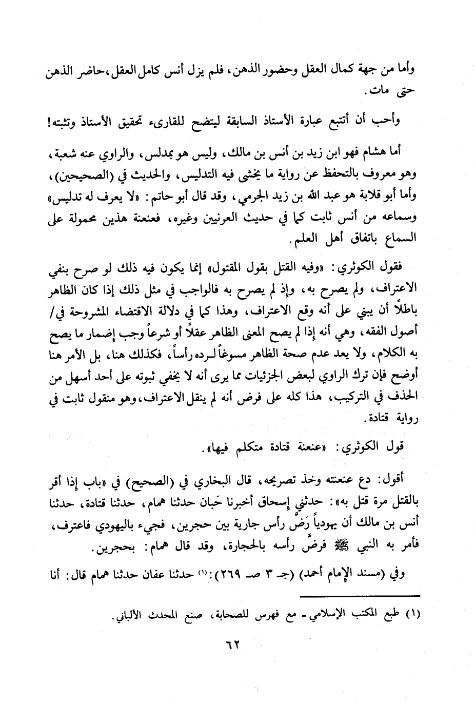 قول الكوثري: «عنعنة قتادة متكلم فيها» .