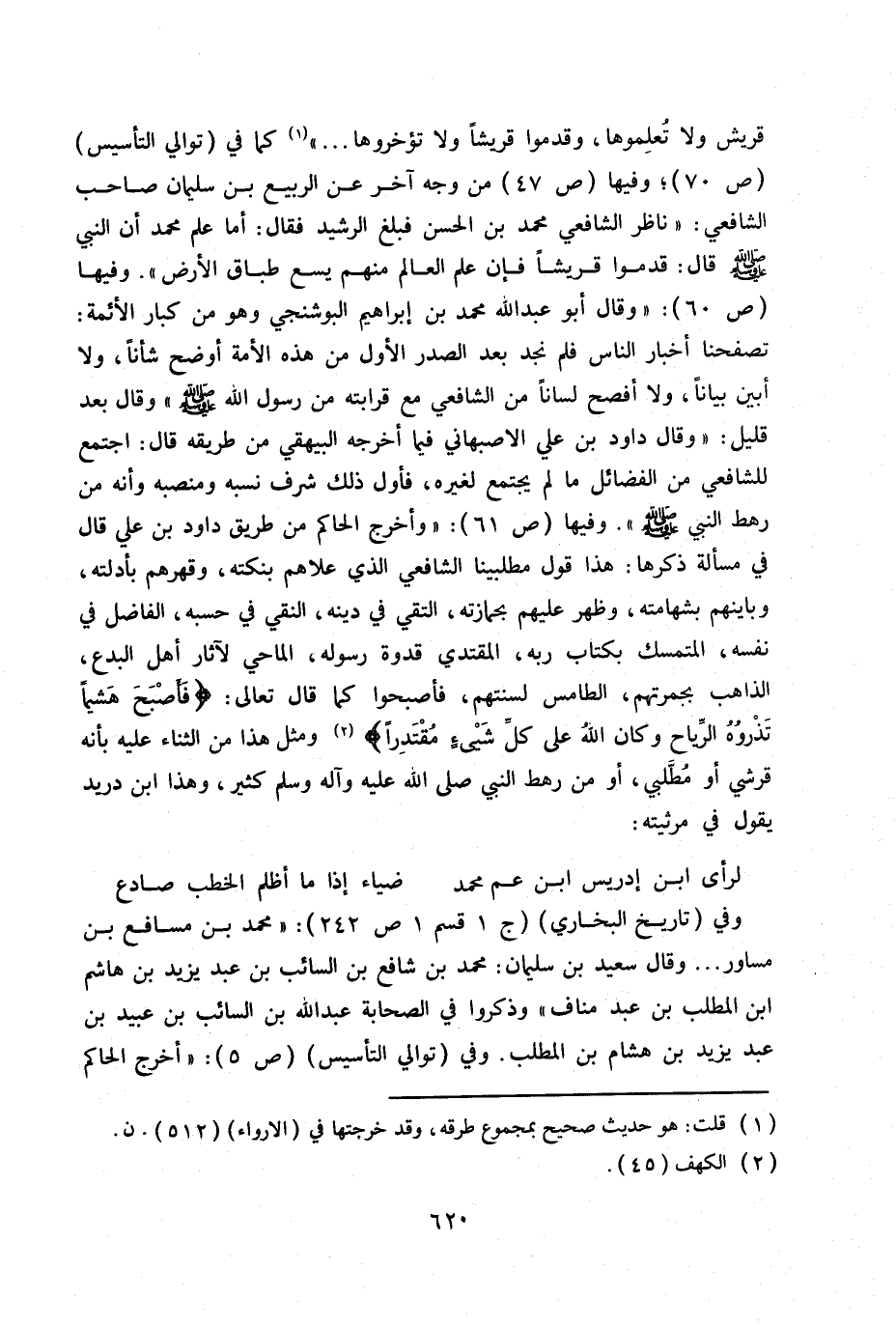 وفيها ص 61: «وأخرج الحاكم من طريق داود بن علي قال في مسألة ذكرها: هذا قول مطلبينا الشافعي الذي علاهم بنكته وقهرهم بأدلته وباينهم بشهامته وظهر عليهم بحمازته، التقي في دينه النقي في حسبه الفاضل في نفسه المتمسك بكتاب ربه المقتدي قدوة رسوله الماحي لآثار أهل البدع الذاهب بجمرتهم الطامس لسنتهم فأصبحوا كما قال تعالى: {فأصبح هشيما تذروه الرياح وكان الله على كل شيء مقتدرا} » ومثل هذا من الثناء عليه بأنه قرشي أو مطلبي أو من رهط النبي صلى الله عليه وآله وسلم كثير وهذا ابن دريد يقول في مرثيته: