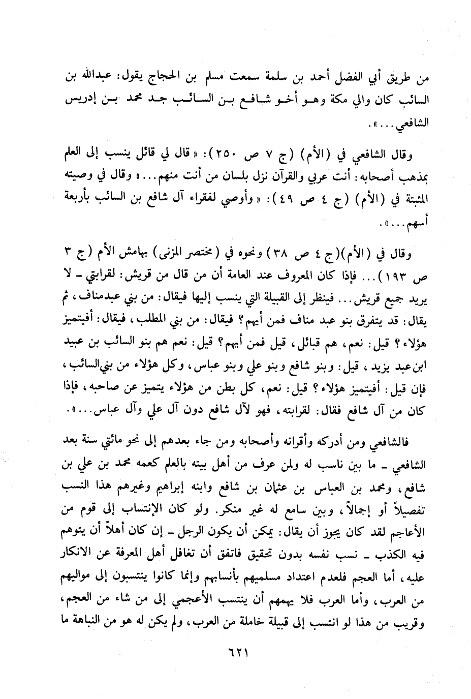 وقال في (الأم) ج 4 ص 38 ونحوه في (مختصر المزني) بهامش الأم ج 3 ص 193 ... فماذا كان المعروف عند العامة أن من قال من قريش: لقرابتي - لا يريد جميع قريش ... فينظر إلى القبيلة التي ينسب إليها فيقال: من بني عبد مناف، ثم يقال: قد يتفرق بنو عبد مناف فمن أيهم؟ فبقال: من بني المطلب، فيقال: أفيتميز هؤلاء؟ قيل: نعم، هم قبائل، قيل فمن أيهم؟ قيل: نعم هم بنو السائب بن عبيد ابن عبد يزيد، قيل: وبنو شافع وبنو علي وبنو عباس، وكل هؤلاء من بني السائب، فإن قيل: أفيتميز هؤلاء؟ قيل: نعم، كل بطن من هؤلاء يتميز عن صاحبه، فإذا كان من آل شافع فقال: لقرابته، فهو لآل شافع دون آل علي وآل عباس ... » .