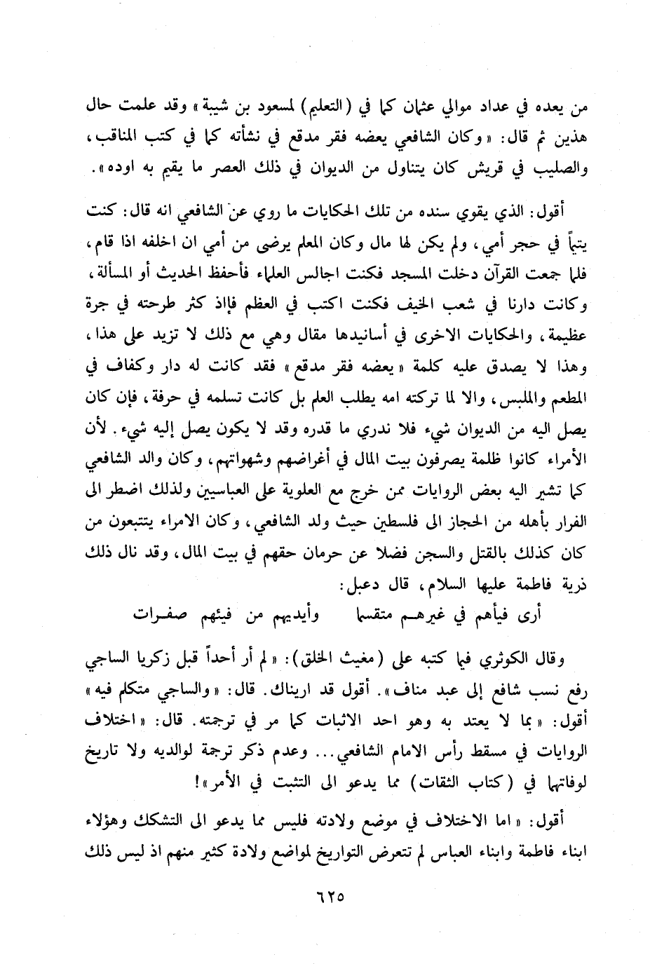 أقول: الذي يقوي سنده من تلك الحكايات ما روي عن الشافعي أنه قال: كنت يتيماً في حجر أمي ولم يكن لها مال وكان المعلم يرضى من أمي أن أخلفه إذا قام فلما جمعت القرآن دخلت المسجد فكنت أجالس العلماء فأحفظ الحديث أو المسألة وكانت دارنا في شعب الخيف فكنت أكتب في العظم فإذا كثر طرحته في جره عظيمة، والحكايات الأخرى في أسانيدها مقال وهي مع ذلك لا تزيد على هذا، وهذا لا يصدق عليه كلمة «يعضه فقره مدقع» فقد كانت له دار وكفاف في المطعم والملبس وإلا لما تركته أمه يطلب العلم بل كانت تسلمه في حرفة، فإن كان يصل إليه من الديوان شيء فلا ندري ما قدره وقد لا يكون يصل إليه شيء لأن الأمراء كانوا ظلمة يصرفون بيت المال في أغراضهم وشهو اتهم، وكان والد الشافعي كما تشير إليه بعض الروايات ممن خرج مع العلوية على العباسين ولذلك اضطر إلى الفرار بأهله من الحجاز إلى فلسطين حيث ولد الشافعي وكان الأمراء يتتبعون من كان كذلك بالقتل والسجن فضلا عن حرمان حقهم في بيت المال، وقد نال ذلك ذرية فاطمة عليها السلام قال دعبل: