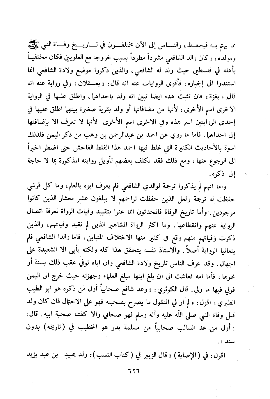 وأما أنهم لم يذكروا ترجمة لوالدي الشافعي فلم يعرف أبوه بالعلم، وما كل قرشي حفظت له ترجمة ولعل الذين حفظت تراجمهم لا يبلغون عشر معشار الذين كانوا موجودين. وأما تاريخ الوفاة فالمحدثون إنما عنوا بتقيد وفيات الرواة لمعرفة اتصال الرواية عنهم وانقطاعها، وما أكثر الرواة المشاهير الذين لم تقيد وفياتهم والذين ذكرت وفياتهم منهم وقع في كثير منها الاختلافات المتباينة فأما والدا الشافعي فلم يتعانيا الرواية أصلا والأستاذ نفسه يتحقق هذا كله ولكن يأبى إلا الشعبذة على الجهال وقد عرف الناس تاريخ ولادة الشافعي وأن أباه توفي عقب ذلك بستة أو نحوها فأما أمه فعاشت إلى أن بلغ أبها مبلغ العلماء وجهزته حيث خرج إلى اليمن فولي فيها ما ولي قال الكوثري: «وعد شافع صحابيا أول من ذكره هو أبو الطيب الطبري» أقول: لم أر في المنقول ما يصرح بصحبته فهو على الاحتمال فإن كان ولد قبل وفاة النبي صلى الله عليه وآله وسلم فهو صحابي وإلا كفتنا صحبة أبيه. قال: «أول من عد السائب صحابيا من مسلمة بدر هو الخطيب في (تاريخه) بدون سند» .
