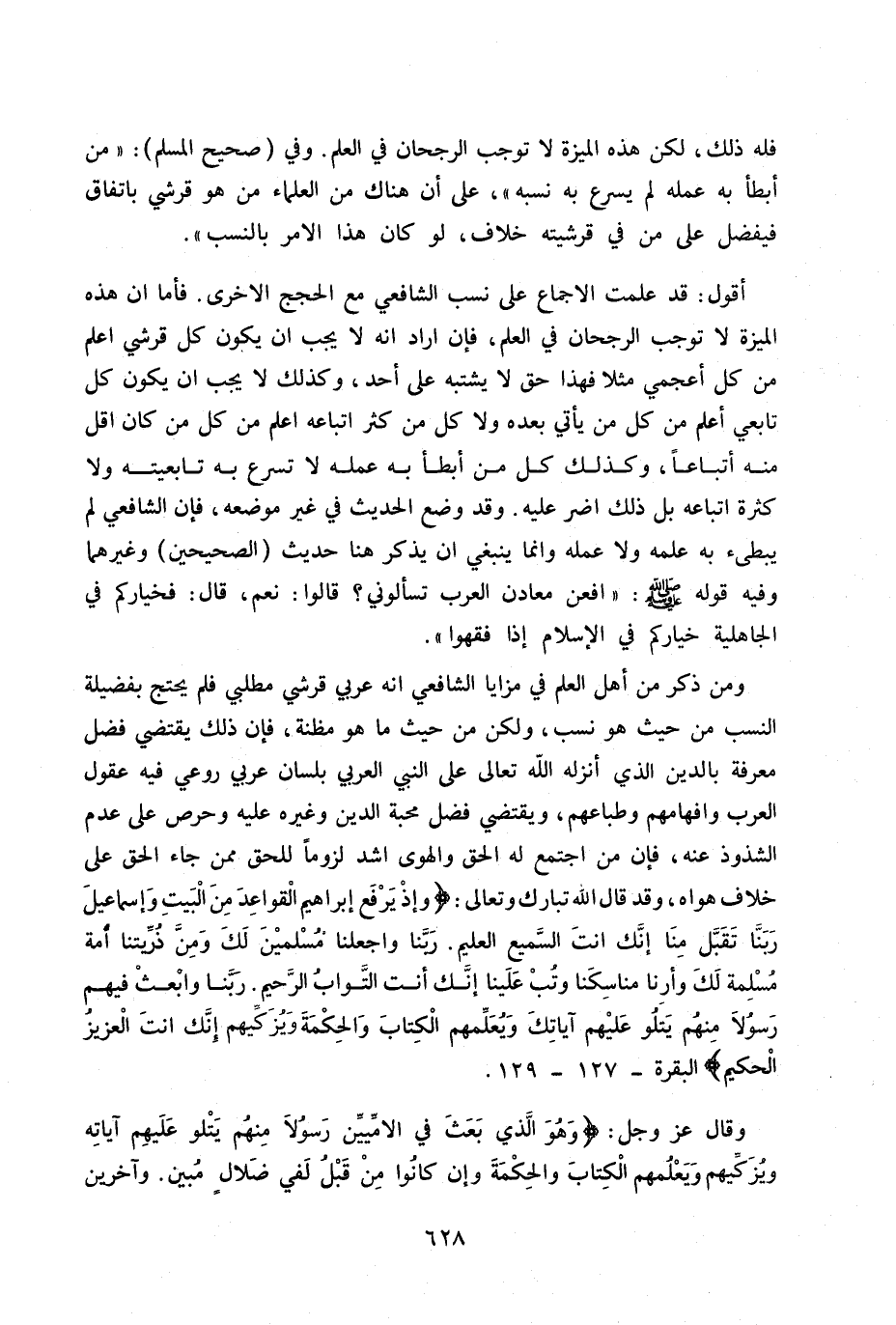 ومن ذكر من أهل العلم في مزايا الشافعي أنه عربي قرشي مطلبي فلم يحتج بفضلية النسب من حيث هو نسب، ولكن من حيث ما هو مظنة، فإن ذلك يقتضي فضل معرفة بالدين الذي أنزله الله تعالى على النبي العربي بلسان عربي روعي فيه عقول العرب وإفهامهم وطباعهم، ويقتضي فضل محبة الدين وغيره وحرص على عدم الشذوذ عنه، فإن من أجتمع له الحق والهوى أشد لزوما للحق ممن جاء الحق خلاف هواه، وقد قال الله تبارك وتعالى: «وَإِذْ يَرْفَعُ إِبْرَاهِيمُ الْقَوَاعِدَ مِنَ الْبَيْتِ وَإِسْمَاعِيلُ رَبَّنَا تَقَبَّلْ مِنَّا إِنَّكَ أَنْتَ السَّمِيعُ الْعَلِيمُ» (البقرة:127) «رَبَّنَا وَاجْعَلْنَا مُسْلِمَيْنِ لَكَ وَمِنْ ذُرِّيَّتِنَا أُمَّةً مُسْلِمَةً لَكَ وَأَرِنَا مَنَاسِكَنَا وَتُبْ عَلَيْنَا إِنَّكَ أَنْتَ التَّوَّابُ الرَّحِيمُ» «رَبَّنَا وَابْعَثْ فِيهِمْ رَسُولاً مِنْهُمْ يَتْلُو عَلَيْهِمْ آيَاتِكَ وَيُعَلِّمُهُمُ الْكِتَابَ وَالْحِكْمَةَ وَيُزَكِّيهِمْ إِنَّكَ أَنْتَ الْعَزِيزُ الْحَكِيمُ» (البقرة - 127- 129) . وقال عز وجل: «هُوَ الَّذِي بَعَثَ فِي الْأُمِّيِّينَ رَسُولاً مِنْهُمْ يَتْلُو عَلَيْهِمْ آيَاتِهِ وَيُزَكِّيهِمْ وَيُعَلِّمُهُمُ الْكِتَابَ وَالْحِكْمَةَ وَإِنْ كَانُوا مِنْ قَبْلُ لَفِي ضَلالٍ مُبِينٍ. وَآخَرِينَ