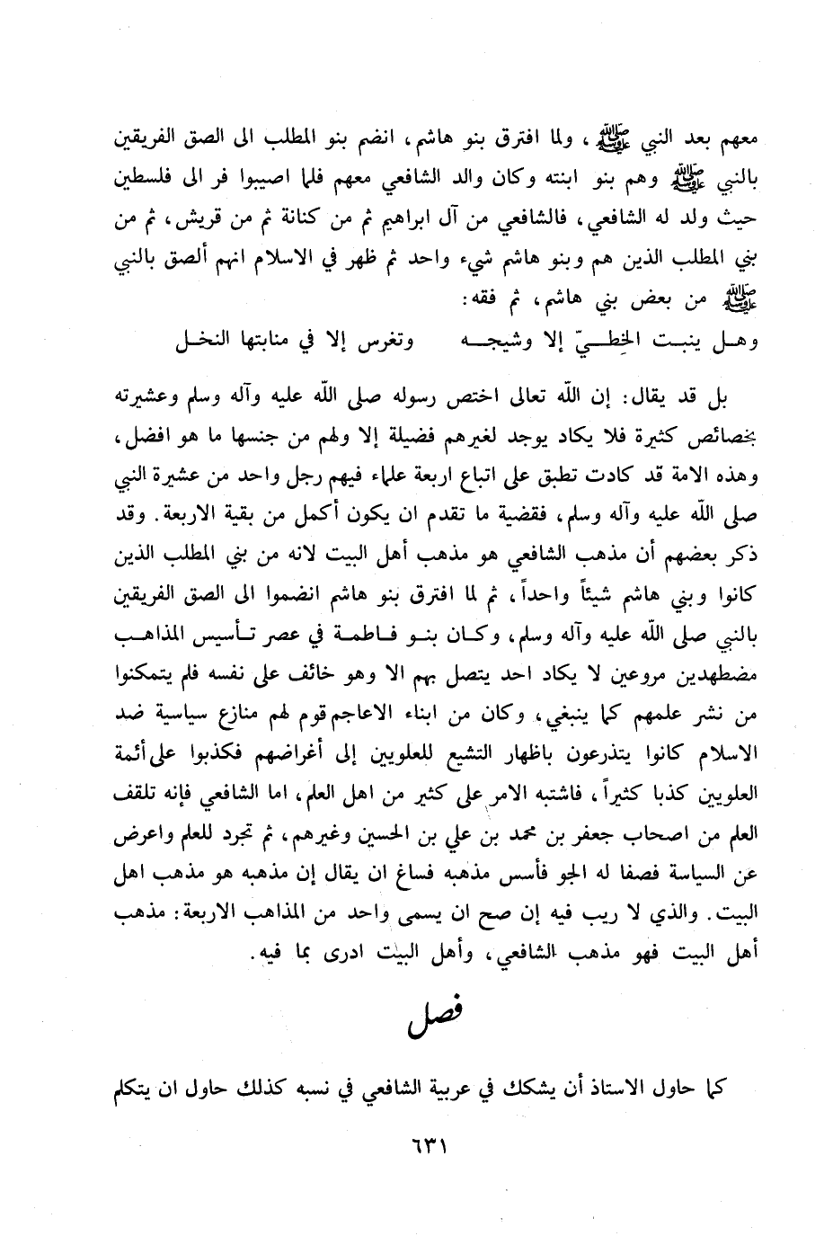 بل قد يقال: إن الله تعالى اختص رسوله صلى الله عليه وآله وسلم وعشيرته بخصائص كثيرة فلا يكاد يوجد لغيرهم فضيلة إلا ولهم من جنسها ما هو أفضل، وهذه الأمة قد كادت تطبق على إتباع أربعة علماء فيهم رجل واحد من عشيرة النبي صلى الله عليه وآله وسلم، فقضية ما تقدم أن يكون أكمل من بقية الأربعة. وقد ذكر بعضهم أن مذهب الشافعي هو مذهب أهل البيت لأنه من بني المطلب الذين كانوا وبني هاشم شيئا واحدا، ثم لما افترق بنو هاشم انضموا إلى ألصق الفريقين بالنبي صلى الله عليه وآله وسلم، وكان بنو فاطمة في عصر تأسيس المذاهب مضطهدين مروعين لا يكاد أحد يتصل بهم إلا وهو خائف على نفسه فلم يتمكنوا من نشر علمهم كما ينبغي، وكان من أبناء الأعاجم قوم لهم منازع سياسية ضد الإسلام كانوا يتذرعون بإظهار التشيع للعلويين إلى أغراضهم فكذبوا على أئمة العلويين كذبا كثيرا، فاشتبه الأمر على كثيرا من أهل العلم، أما الشافعي فإنه تلقف العلم من أصحاب جعفر بن محمد بن علي الحسين وغيرهم، ثم تجرد للعلم وأعرض عن السياسة فصفا له الجو فأسس مذهبه فساغ أن يقال إن مذهبه هو مذهب أهل البيت. والذي لا ريب فيه أنه إن صح يسمى واحد من المذاهب الأربعة: مذهب أهل البيت فهو مذهب الشافعي، وأهل البيت أدرى بما فيه.