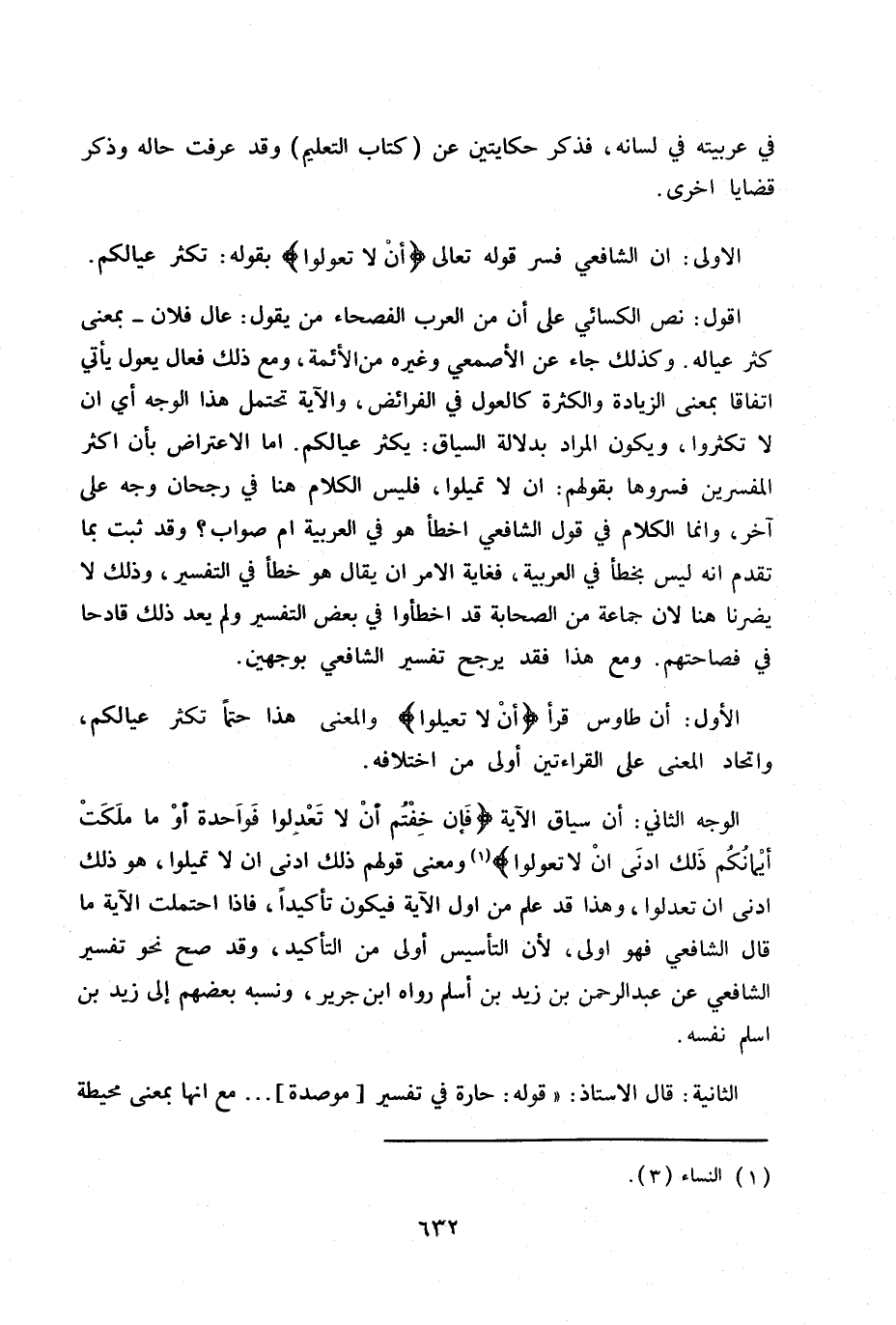 أقول: نص الكسائي على أن من العرب الفصحاء من يقول: عال فلان - بمعنى كثر عياله. وكذلك جاء عن الأصمعي وغيره من الأئمة، ومع ذلك فعال يعول يأتي اتفاقا بمعنى الزيادة والكثرة كالعول في الفرائض، والآية تحتمل هذا الوجه أي أكثر أن لا تكثروا، ويكون المراد بدلالة السياق: يكثر عيالكم. أما الاعتراض بأن أكثر المفسرين فسروها بقولهم: أن لا تميلوا، فليس الكلام هنا في رجحان وجه على آخر، وإنما الكلام في قول الشافعي أخطأ هو في العربية أم صواب؟ وقد ثبت بما تقدم أنه ليس بخطأ في العربية، فغاية الأمر أن يقال هو خطأ في التفسير، وذلك لا يضرنا هنا لأن جماعة من الصحابة قد أخطأوا في بعض التفسير ولم يعد ذلك قادحا في فصاحتهم. ومع هذا فقد يرجح تفسير الشافعي بوجهين.