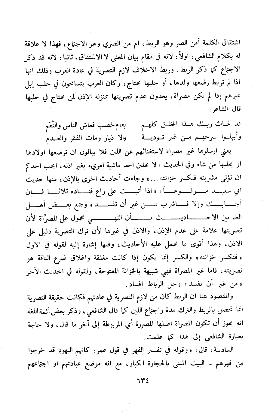 اشتقاق الكلمة أمن الصر وهو الربط، أم من الصري وهو الاجتماع، فهذا لا علاقة له بكلام الشافعي، أولا: لأنه في مقام بيان المعنى لا الاشتقاق، ثانيا: لأنه قد ذكر الاجتماع كما ذكر الربط. وربط الإخلاف لازم التصرية في عادة العرب وذلك أنها إذا لم تربط رضعها ولدها، أو حلبها محتاج، وكان العرب يتسامحون في حلب إبل غيرهم إذا لم تكن مصراه، يعدون عدم تصريتها بمنزلة الإذن لمن يحتاج في حلبها قال الشاعر: