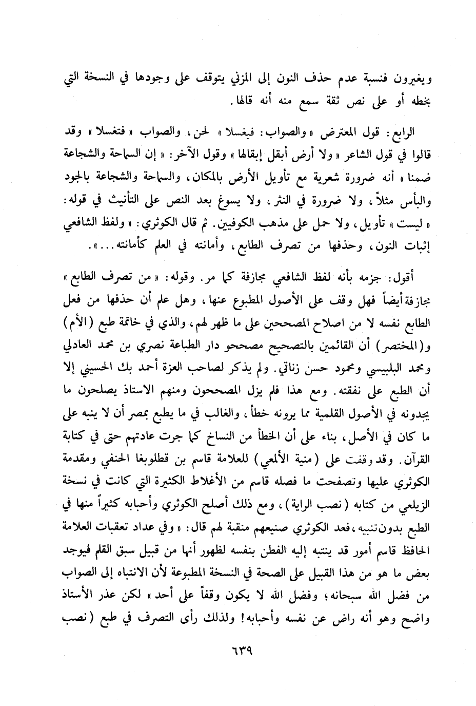 أقول: جزمه بأنه لفظ الشافعي مجازفة كما مر. وقوله: «من تصرف الطابع» مجازفة أيضا فهل وقف على الأصول المطبوع عنها ن وهل علم آن حذفها من فعل الطابع نفسه لا من إصلاح المصححين على ما ظهر لهم ن والذي في خاتمة طبع (الأم) و (المختصر) أن القائمين بالتصحيح مصححودار الطباعة نصري بن محمد العادلي ومحمد العادلي ومحمد البلبيسي ومحمود حسن زناتي. ولم يذكر لصاحب العزة أحمد بك الحسيني إلا أن الطبع على نفقته. ومع هذا فلم يزل المصححون ومنهم الأستاذ يصلحون ما يجدونه في الأصول القلمية مما يرونه خطأ، والغالب في ما يطبع بمصر أن لا ينبه على ما كان في الأصل، بناء على أن الخطا من النساخ كما جرت عاداهم حتى في كتابة القرآن. وقد وقفت على (منية الألمعي) للعلامة قاسم بن قطلوبنا الحنفي ومقدمة الكوثري عليها وتصفحت ما فصله قاسم من الأغلاط الكثيرة التي في نسخة الزيلعي من كتابه (نصب الراية) ، ومع ذلك أصلح الكوثري وأحبابه كثيرا منها في الطبع بدون تنبيه فعد الكوثري صنيعهم منقبة لهم قال: «وفي عداد تعقبات العلاقة الحافظ قاسم أمور قد يتبه إليها الفطن بنفسه لظهور أنها من قبيل سبق القلم فيوجد بعض ما هو من هذا القبيل على الصحة في النسخة المطبوعة لأن الانتباه إلى الصواب من فضل الله سبحانه؛ وفضل الله لا يكون وقفا على أحد» لكن عذر الأستاذ واضح وهو أنه راض عن نفسه وأحبابه! ولذلك رأى التصرف في طبع (نصب