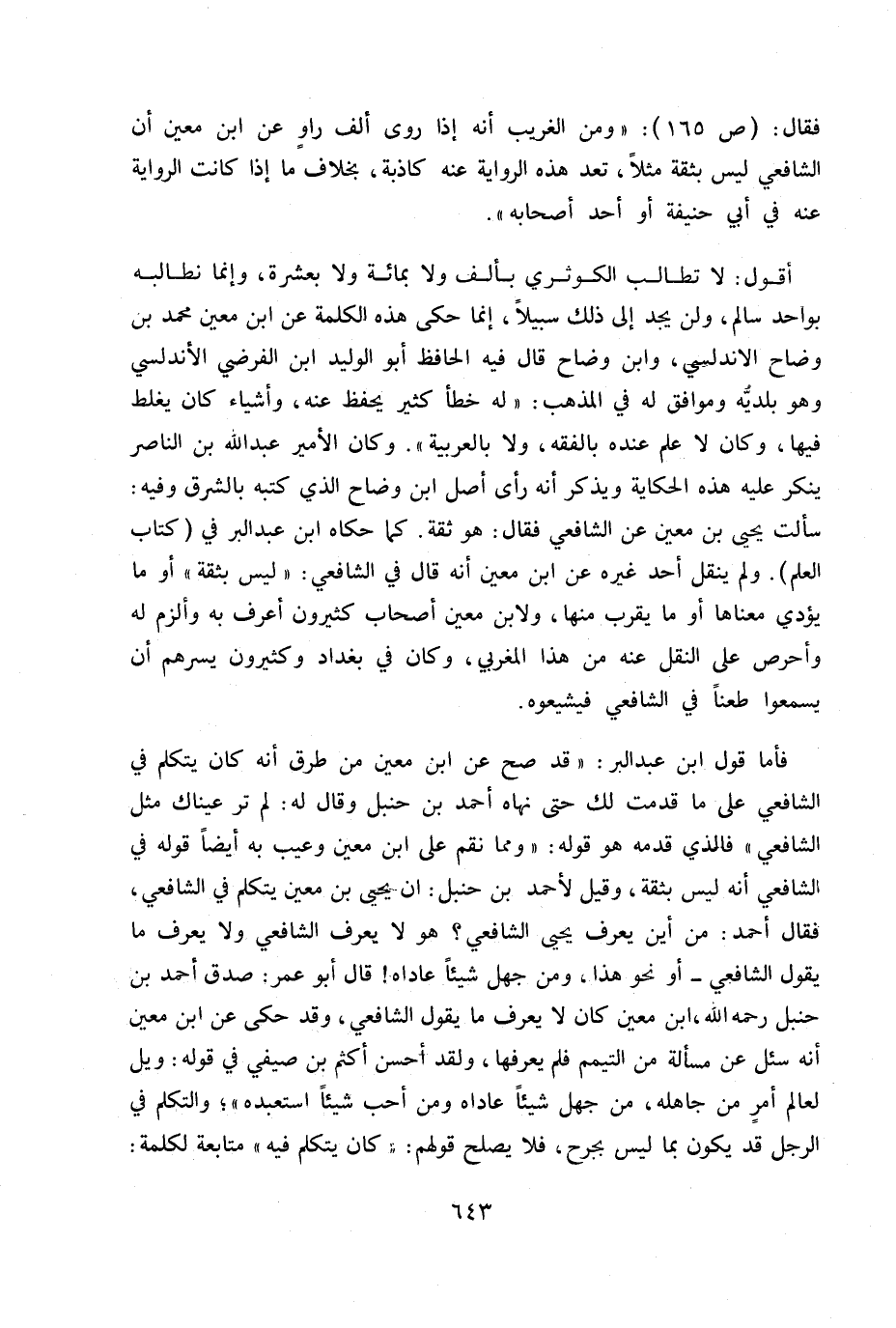 فقال: ص 165: «ومن الغريب أنه إذا روى ألف راوعن ابن معين أن الشافعي ليس بثقة مثلا، تعد هذه الرواية عنه كاذبة، بخلاف ما إذا كانت الرواية عنه في أبي حنيفة أو أحد أصحابه» ! أقول: لا نطالب الكوثري بألف ولا بمائة ولا بعشرة، وإنما نطالبه سالم، ولن يجد إلى ذلك سبيلا، إنما حكى هذه الكلمة عن ابن معين محمد بن وضاح الأندلسي، وابن وضاح قال فيه الحافظ أبووليد ابن الفرضي الأندلسي وهو بلديه وموافق به في المذهب: «له خطأ كثير بحفظ عنه ن وأشياء كان بغلط فيها، وكان لا علم عنده بالفقه، ولا بالعربية» .