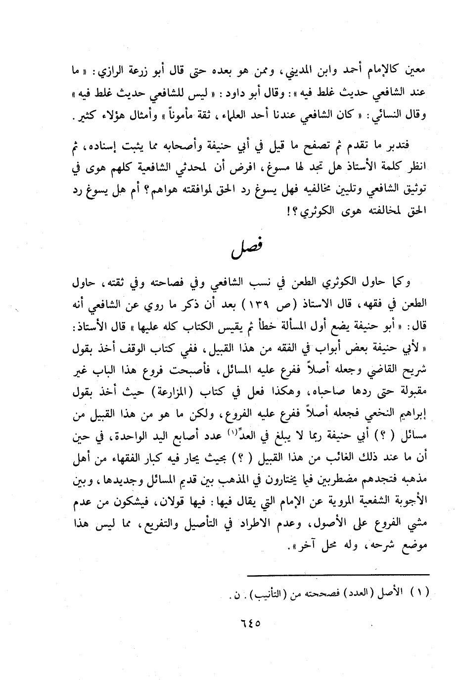 وكما حاول الكوثري الطعن في نسب الشافعي وفي فصاحته وفي ثقته، حاول الطعن في فقهه، قال الأستاذ ص 139 بعد أن ذكر ما روي عن الشافعي أنه قال: «أبو حنيفة يضع أول المسالة خطأ ثم يقيس الكتاب كله عليها» قال الأستاذ: «لأبي حنيفة بعض أبواب في الفقه من هذا القبيل، ففي كتاب الوقف أخذ بقول شريح القاضي وجعله أصلا ففرع عليه المسائل، فأصبحت فروع هذا الباب غير مقبولة حتى ردها صاحباه، وهكذا فعل في كتاب (المزارعة) حيث أخذ بقول إبراهيم النخعي فجعله أصلا ففرع عليه الفروع، ولكن ما هو من هذا القبيل من مسائل (؟) أبي حنيفة ربما لا يبلغ في العد (1) عدد أصابع اليد الواحدة، في حين أن ما عند ذلك العائب من هذا القبيل (؟) بحيث يحار فيه كبار الفقهاء من أهل مذهبه فتجدهم مضطربين فيما يختارون في المذهب بين قديم المسائل وجديدها ن وبين الأجوبة الشفعية المروية عن الإمام التي يقال فيها: فيها قولان ن فيشكون من عدم مشي الفروع على الأصول، وعدم الاطراد في التأصيل والتفريع، ومما ليس هذا موضع شرحه، وله محل آخر» .