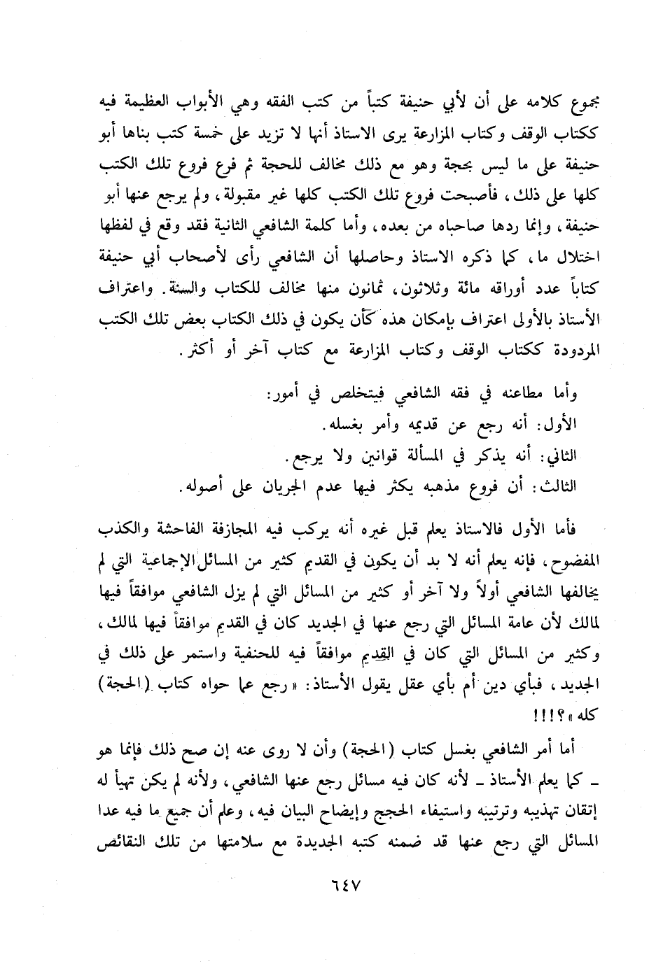 فأما الأول فالأستاذ يعلم قبل غيره أنه يركب فيه المجازفة الفاحشة والكذب المفضوح، فإنه يعلم أنه لا بد أن يكون في القديم كثير من المسائل الإجماعية التي يخالفها الشافعي أو لا ولا أخرا وكثير من المسائل التي لم يزل الشافعي موافقا فيها لمالك لأن عانة المسائل التي رجع عنها في الجديد كان في القديم موافقا فيها لمللك، وكثير من المسائل التي كان في القديم موافقا فيها للحنيفة واستمر على ذلك في الجديد. فبأي دين أم بأي عقل يقول الأستاذ: «رجع عما حواه كتاب (الحجة) كله» ؟ !!!.