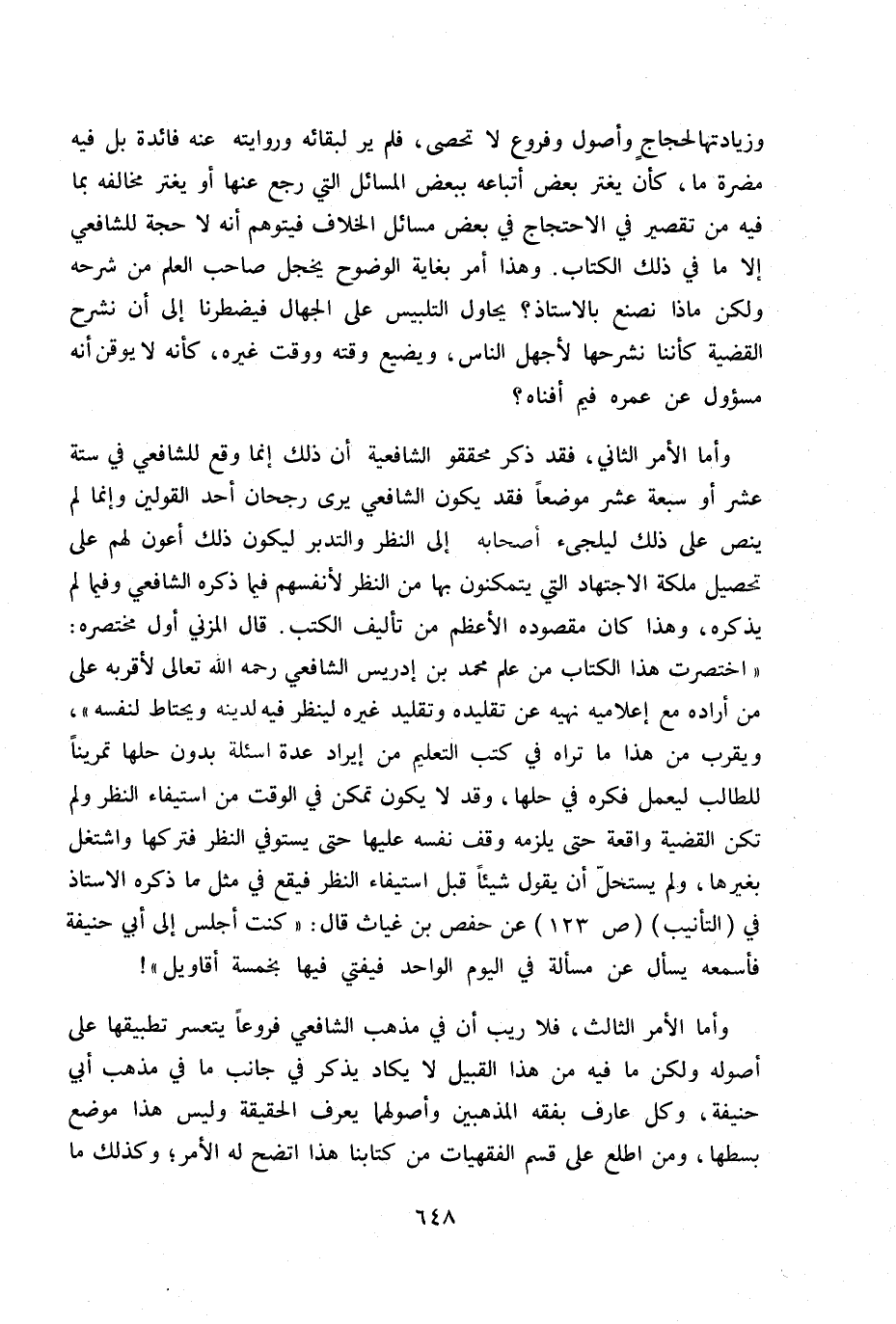 وزيادتها لحجاج وأصول وفروع لا تحصى، فلم ضمنه كتبه الجديدة مع سلامتها من تلك النقائص وزيادنها لحجاج وأصول وفروع لا تحصى، فلم ير لبقائه وروايته عنه فائدة بل فيه مضرة ما، كأن يغتر بعض أتباعه ببعض المسائل التي رجع عنها أو يغتر مخالفة بما فيه من تقصير في الاحتجاج في بعض مسائل الخلاف فيتوهم أنه لا حجة للشافعي إلا ما في ذلك الكتاب. وهذا أمر بغاية الوضوح يخجل صاحب العلم من سرحه ولكن ماذا نصنع بالأستاذ؟ ويحاول التلبيس على الجهال فيضطرنا إلى أن نشرح القضية كأننا نشرحها لأجهل الناس، ويضيع وقته ووقت غيره، كأنه لا يوقن أنه مسؤول عن عمره فيم أفناه؟