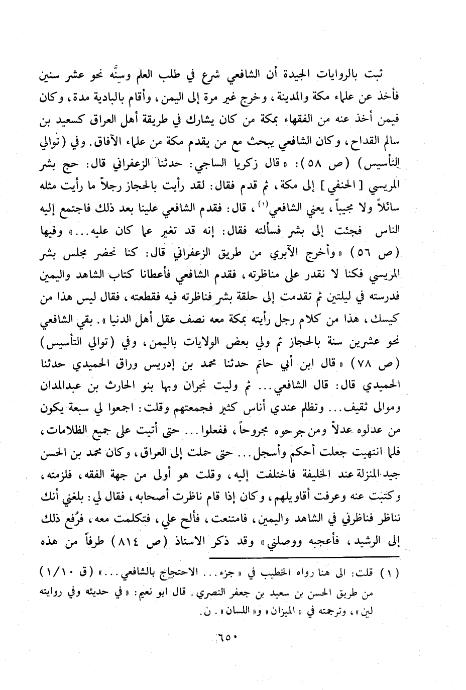 ثبت بالروايات الجيدة أن الشافعي شرع طلب العلم وستة نحوعشر سنين فأخذ عن علماء مكة والمدينة، وخرج غير مرة إلى اليمن، واقام بالبادية مدة، وكان فيمن أخذ عنه من الفقهاء بمكة من كان يشارك في طريقة أهل العراق كسعيد بن القداح، وكان الشافعي يبحث مع من يقدم مكة من علماء الآفاق. وفي (توالي التأسيس) ص 58: «قال زكريا الساجي: حدثنا الزعفراني قال: حج بشر المريسي «الحنفي» إلى مكة ثم قدم فقال: لقد رأيت بالحجاز رجلا ما رأيت مثله ولا مجيبا، يعني الشافعي، (1) قال: فقدم الشافعي علينا بعد ذلك فاجتمع إليه الناس فجئت إلى بشر فسألته فقال: إنه قد تغير عما كان عليه ... » وفيها ص 56 «وأخرج الآبري من طريق الزعفراني قال: كنا نحضر مجلس بشر المريسي فكنا لا نقدر على مناظرته، فقدم الشافعي فأعطانا كتاب الشاهد واليمين فدرسته في ليلتين ثم تقدمت إلى حبقة بشر فناظرته فيه فقطعته، فقال ليس هذا من كيسك، هذا من كلام رجل رأيته بمكة معه نصف عقل أهل الدنيا» . بقي الشافعي نحوعشرين سنة بالحجاز ثم ولي بعض الولايات باليمن، وفي (توالي التأسيس) ص 78 «قال ابن أبي حاتم حدثنا محمد بن إدريس وراق الحميدي حدثنا الحميدي قال: قال الشافعي ... ثم نجران وبها بنوالحارث بن عبد المدان وموالى ثقيف ... وتظلم عندي أناس كثير وقلت: اجمعوا لي سبعة يكون من عدلوه عدلا ومن جرحوه مجروحا، ففعلوا ... حتى آتيت على جميع الظلامات، فلما انتهيت جعلت أحكم واسجل ... حتى حملت إلى العراق ن وكان محمد بن الحسن جيد المنزلة عند الخليفة فاختلفت غليه ن وقلت هو أولى من حهة الفقه، فلزمته، وكتبت عنه وعرفت أقاويلهم ن وكان إذا قام ناظرت أصحابه، فقال لي ك بلغني انك تناظر فناظرني في الشاهد واليمين، فامتنعت، فألح علي، فتكلمت معه، فرفع ذلك إلى الرشيد، فأعجبه ووصلني» وقد ذكر الأستاذ ص 184 طرفا من هذه