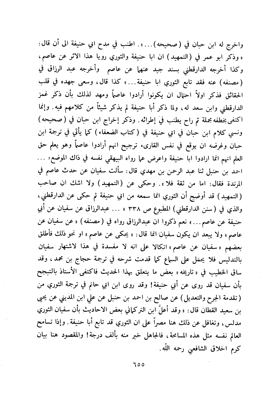 وأخرج له ابن حبان في (صحيحه) ... » أطنب في مدح أبي حنيفة إلى إن قال: «وذكر أبو عمر في. التمهيد) أن أبا حنيفة والثوري رويا هذا الأثر عن عاصم ن وكذا أخرجه الدارقطني بسند جيد عنهما عن عاصم وأخرجه عبد الرزاق في (مصنفه) عنه فقد تابع الثوري أبا حنيفة..» كذا قال، وسعى جهده في قلب الحقائق فذكر أو لا أن يكونوا أرادوا عاصما ومهد لذلك بأن ذكر غمز الدارقطني وابن سعد له، ولما ذكر أبا حنيفة لم يذكر شيئا من كلامهم فيه. وإنما اكفى بخطفه مجملة ثم راح يطنب في إطرائه. وذكر إخراج ابن حبان في (صحيحه) ونسى كلام ابن حبان في أبي حنيفة في (كتاب الضعفاء) كما يأتي في ترجمة ابن حبان وغرضه أن يوقع في نفس القرىء. ترجيح أنهم أرادوا عاصما أرادوا أبا حنيفة وأعرض عما رواه البيهقي نفسه في ذاك الموضع « ... أحمد بن حنبل ثنا عبد الرحمن بن مهدي قال: سألت سفيان عن حديث عاصم في المرتدة فقال: أما من ثقة فلا» . وحكى عن (التمهيد) ولا أشك أن صاحب (التمهيد) قد أو ضح أن الثوري إنما سمعه من أبي حنيفة ثم حكى عن الدارقطني، والذي في (سنن الدارقطني) المطبوع ص 338 « ... عبد الرزاق عن سفيان عن ابي حنيفة عن عاصم ... » نعم ذكروا أن عبد الرزاق رواه في (مصنفه) «عن سفيان عن عاصم» ولا يبعد أن يكون سفيان إنما قال: «يحكى عن عاصم» أو نحو ذلك فأطلق بعضهم «سفيان عن عاصم» اتكالا على أنه لا مفسدة في هذا لاشتهار سفيان بالتدليس فلا فلا يحمل على السماع كما قدمت شرحه في ترجمة حجاج بن محمد، وقد ساق الخطيب في (تاريخه) بعض ما يتعلق بهذا الحديث فاكتفى الأستاذ بالتبجح بأن سفيان قد روى عن ابي حنيفة! وقد روى ابن ابي حاتم في ترجمة الثوري من (تقدمه الجرح والتعديل) عن صالح بن أحمد بن حنبل عن علي ابن المديني عن يحيى بن سعيد القطان قال: «سألت سفيان عن حديث عاصم في المرتدة فانكر وقال: «ليس من حديثي» وقد أعل ابن التركماني بعض الأحاديث بان الثوري مدلس، وتغافل عن ذلك هنا مصرا على إن الثوري قد تابع أبا حنيفة. وإذا تسامح العالم نفسه مثل هذه المسامحة، فالجاهل خير منه بألف درجة! والمقصود هنا بيان كرم أخلاق الشافعي رحمه الله.