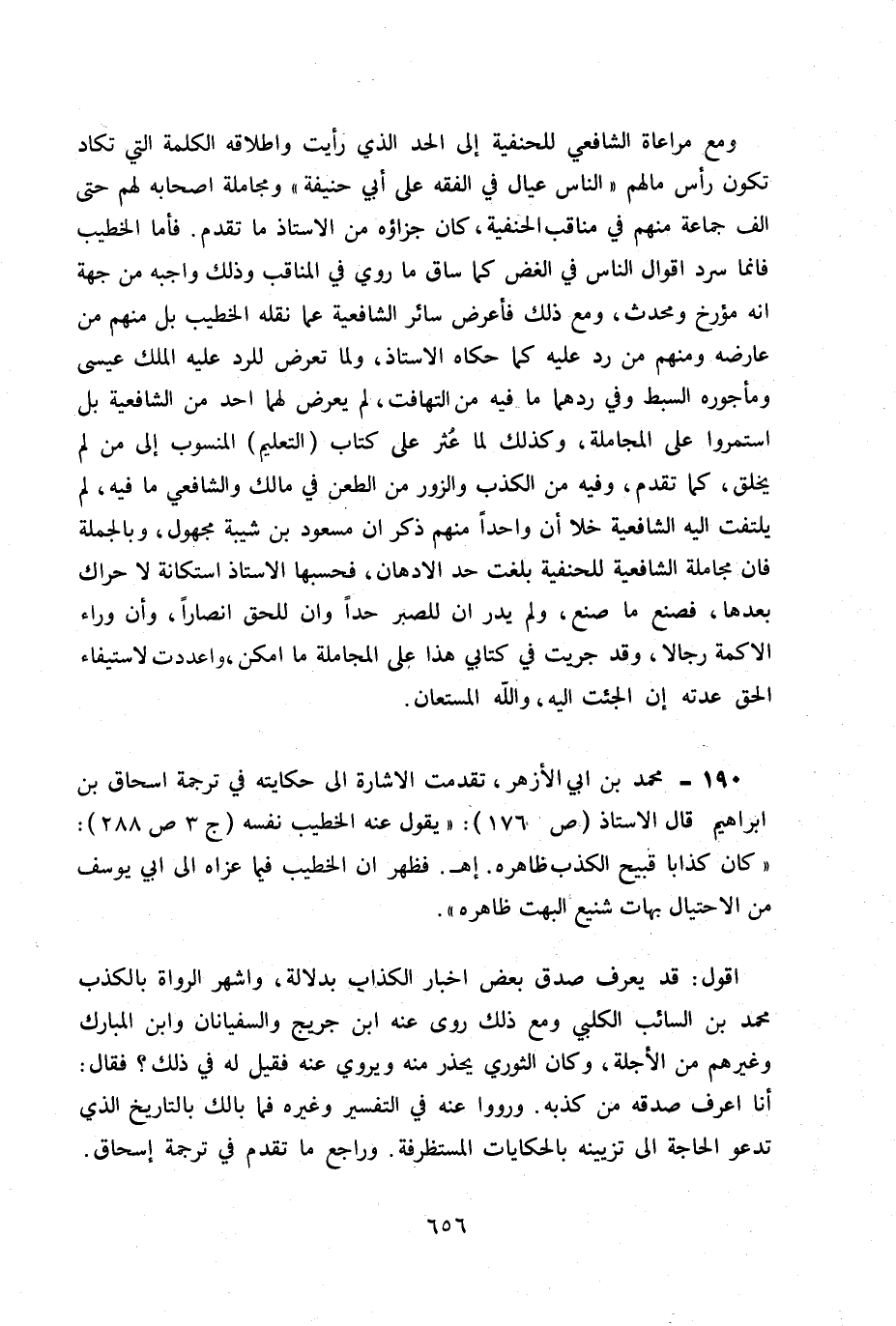 ومع مراعاة الشافعي للحنفية إلى حد الذي رأيت وإطلاقه الكلمة التي تكاد تكون رأس مالهم «الناس عيال في الفقه على أبي حنيفة» ومجاملة أصحابه لهم حتى آلف جماعة منهم في مناقب الحنفية كان جزاؤه من الأستاذ ما تقدم. فأما الخطيب فإنما سرد أقوال الناس في الغض كما ساق ما روي في المناقب وذلك واجبه من جهة أنه مؤرخ ومحدث ن ومع ذلك فأعرض سائر الشافعية عما نقله الخطيب بل منهم من عرضه ومنهم من عارضه ومنهم من رد عليه كما حكاه الأستاذ، ولما تعرض للرد عليه الملك عيسى ومأجورة السبط وفي ردهما ما فيه من التهافت لم يعرض لهما أحد من لم يخلق كما تقدم، وفيه إن واحدا منهم ذكر إن مسعود بن شيبة مجهول، وبالجملة فإن مجاملة الشافعية للحفية بلغت حد الادهان ن فحسبها الأستاذ استكانة لا حراك بعدها ن فصنع ما صنع، ولم يدر أن للصبر حدا وأن للحق أنصارا، وأن وراء الأئمة رجالا، وقد جريت في كتابي هذا على المجاملة ما أمكن ن وأعددت لاستيفاء الحق عدته إن ألجئت إليه. والله المستعان.