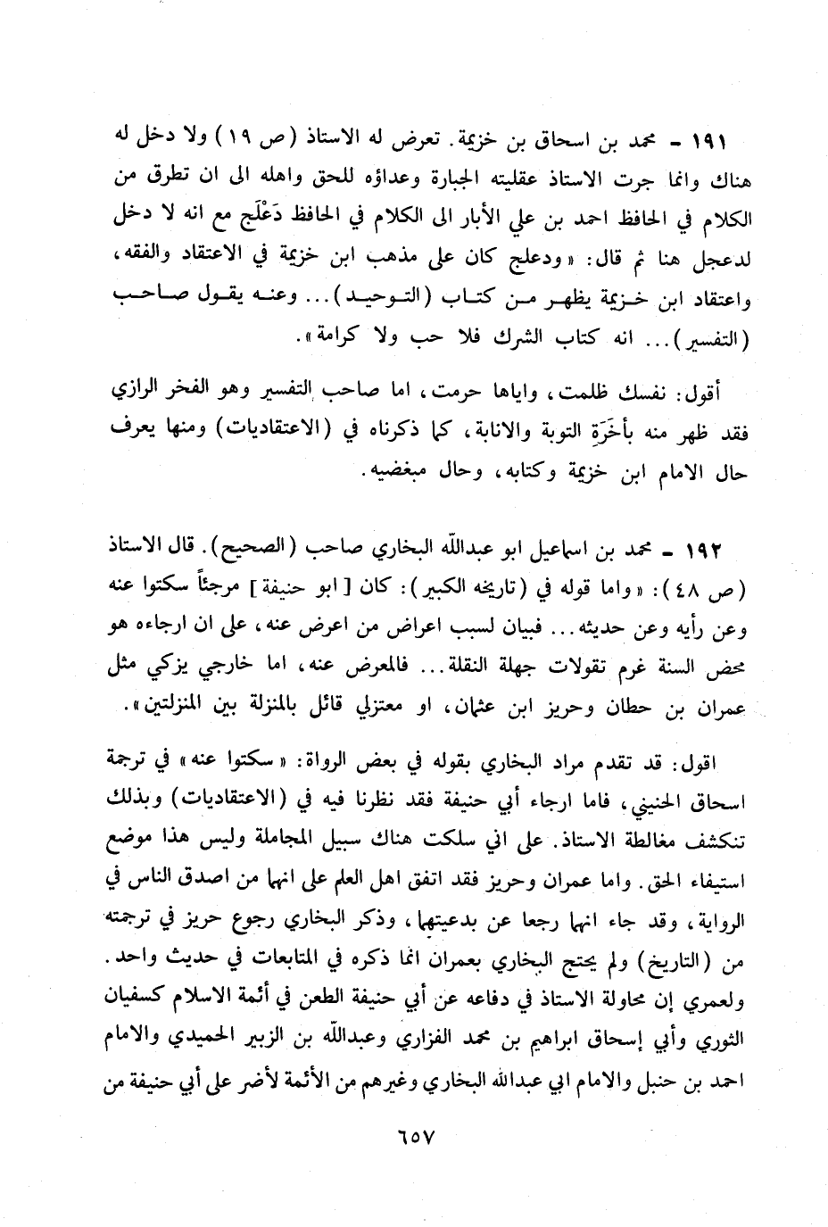 192- محمد بن إسماعيل أبو عبد الله البخاري صاحب (الصحيح) . قال الأستاذ ص 48: «وأما قوله في (تاريخ الكبير) : كان «أبو حنيفة» مرجئا سكتوا عنه وعن رأيه وعن حديثه ... فبيان لسبب إعراض من أعرض عنه، على أن إرجاءه هو محض السنة رغم تقولات جهلة النقلة، ... فالمعرض عنه، إما خارجي يزكي مثل عمران بن حطان وحريز بن عثمان، أو معتزلي قائل بالمنزلة بيت المنزلتين» .