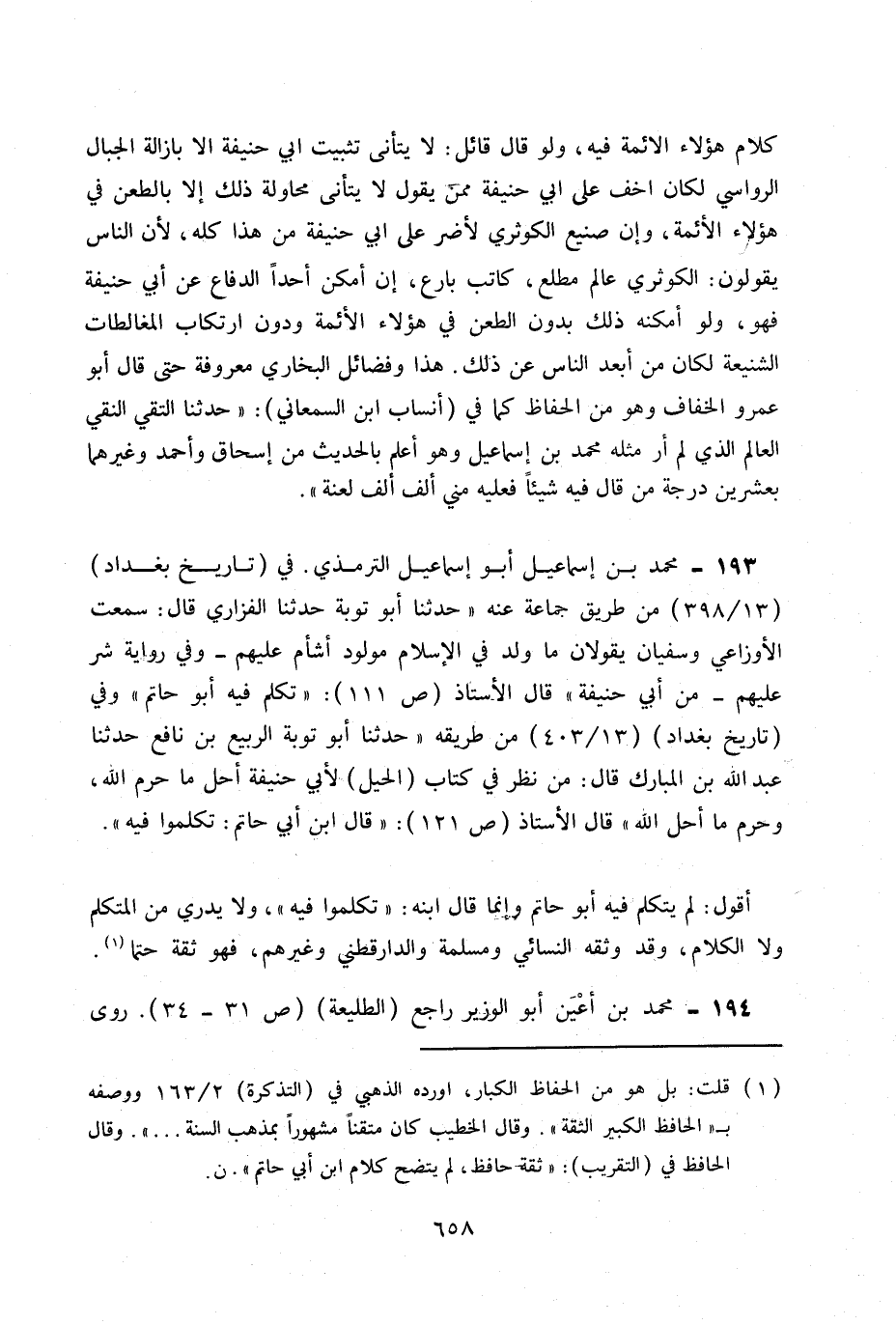 كلام هؤلاء الأئمة فيه، ولو قال قائل: لا يتأتى تثبيت أبي حنيفة إلا بإزالة الجبال الرواسي لكان أخف على ابي حنيفة ممن يقول لا يتأتي محاولة ذلك إلا بالطعن في هؤلاء الأئمة، وإن صنيع الكوثري لأضر على أبي حنيفة من هذا كله، لأنم الناس يقولون الكوثري عالم مطلع، كاتب بارع، إن أمكن أحدا الدفاع عن أبي حنيفة فهو، ولوأمكنه ذلك بدون الطعن في هؤلاء الأئمة ودون ارتكاب المغالطات الشنيعة لكان من ابعد الناس عن ذلك. هذا وفضائل البخاري معروفة حتى قال ابوعمروالخفاف وهو من الحفاظ كما في (أنساب ابن السمعاني) : «حدثنا التقي النقي العالم الذي لم أر مثله محمد بن إسماعيل وهو أعلم بالحدبث من إسحاق وأحمد وغيرهما بعشرين درجة. من قال فيه شيئا فعليه مني ألف لعنة» .