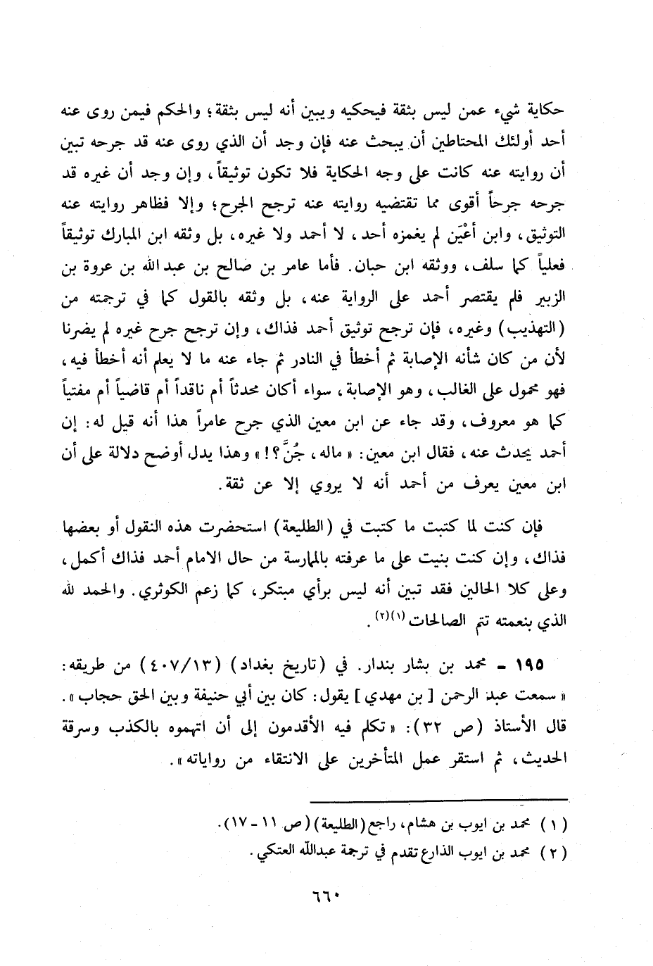 195- محمد بن بشار بندار. في (تاريخ بغداد) 13 / 407 من طريقة: «سمعت عبد الرحمن «بن مهدي» يقول: كان بين ابي حنيفة وبين الحق حجاب» . قال الأستاذ ص 32: «تكلم فيه الأقدمون إلى أن اتهموا بالكذب وسرقة الحديث، ثم استقر عمل المتأخرين على الانتقاء من رواياته» .