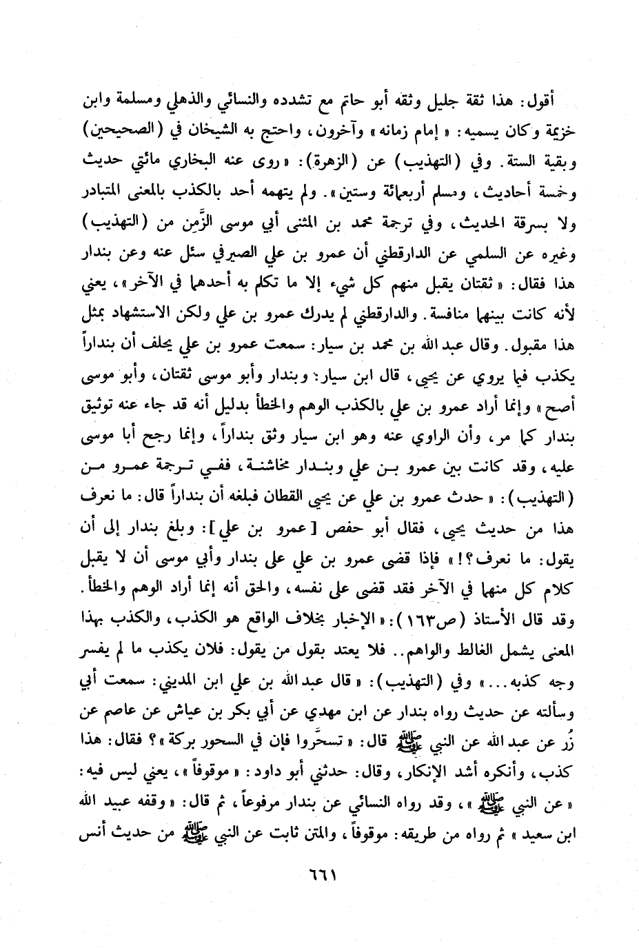 أقول: هذا ثقة جليل وثقة أبو حاتم مع تشدده والنسائي والذهلي ومسلمة وابن خزيمة وكان يسميه: «إمام زمانه» وآخرون، واحتج به الشيخان في (الصحيحين) وبقية الستة. وفي (التهذيب) عن (الزهرة) : «روى عنه البخاري مائتي حديث وخمسة أحاديث، ومسلم أربعمائة وستين» . ولم يتهمه أحد بالكذب بالمعنى المتبادر ولا بسرقة الحديث، وفي ترجمة محمد بن المثنى أبي موسى الزمن من (التهذيب) وغيره عن السلمي عن الدارقطني أن عمرو بن علي الصيرفي سئل عنه وعن بندار هذا فقال: «ثقتان يقبل منهم كل شيء إلا ما تكلم به أحدهما في الآخر» يعني لأنه كانت بينهما منافسة. والدارقطني لم يدرك عمرو بن علي ولكن الاستشهاد بمثل هذا مقبول. وقال عبد الله بن محمد بن يسار: سمعت عمرو بن علي يحلف أن بندارا يكذب فيما يروي عن يحيى، قال ابن سيار: وبندار وأبو موسى ثقتان، وأبو موسى اصح» وإنما أراد عمرو بن علي بالكذب الوهم والخطأ بدليل أنه قد جاء عنه توثيق بندار كما مر، وأن الراوي عنه وهو ابن سيار وثق بندارا، وإنما رجح آبا موسى عليه ن وقد كانت بين عمرو بن علي وبندار مخاشنة، ففي ترجمة عمرومن (التهذيب) : «حدث عمرو بن علي عن يحيى القطان فبلغه أن بندارا إلى أن قال ك ما نعرف هذا من حديث يحيى، فقال أبوحفص «عمروابن علي» : وبلغ بندار إلى أن يقول: ما نعرف؟ !» فهذا قضى عمرو بن علي بندار وأنى موسى أن لا يقبل كلام كل منهما في الآخر فقد قضى على نفسه ن والحق انه أراد إنما أراد الوهم والخطأ. وقد قال الأستاذ ص 163: «الإخبار بخلاف الواقع هو يكذب ما لم يفسر وجه كذبة ... » وفي (التهذيب) : «قال عبد الله بن علي ابن المديني: سمعت أبي وسألته عن حديث رواه بندار عن ابن مهدي عن أبي مهدي عن أبي بكر بن عياش عن عاصم عن زر عن عبد الله عن النبي صلى الله عليه وسلم قال: «تسحروا فإن في السحور بركة» ؟ فقال: هذا كذب، وأنكره أشد الإنكار، وقال: حدثني أبو داود: «موقوفا» ، يعني ليس فيه: «عن النبي صلى الله عليه وسلم» ، وقد رواه النسائي عن بندار مرفوعا، ثم قال: «وقفه عبيد الله بن سعيد» ثم رواه من طريقة: موقوفا، والمتن ثابت عن النبي صلى الله عليه وسلم من حديث أنس