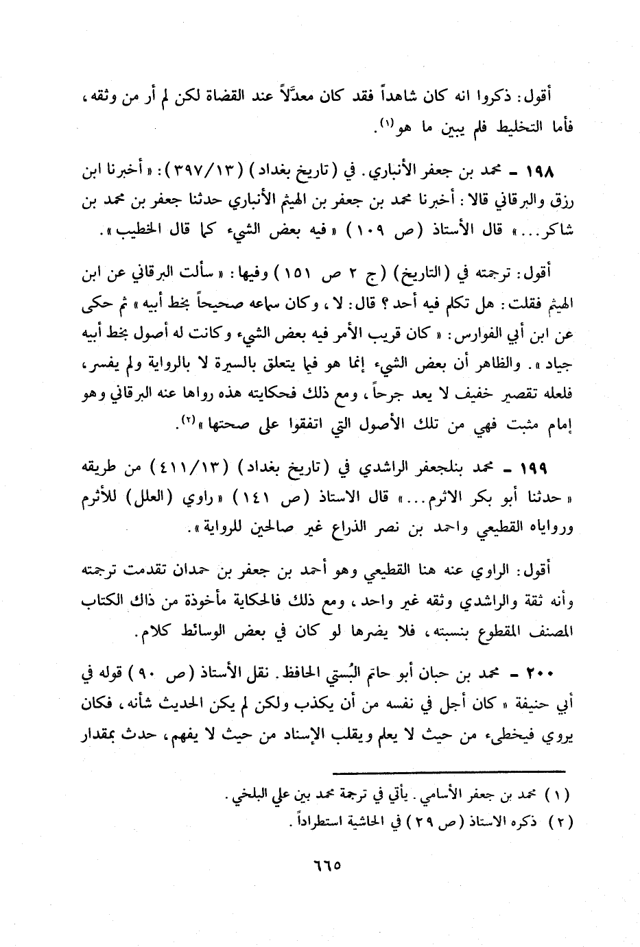 199- محمد بن جعفر الراشدي. في (تاريخ بغداد) 13 / 411 من طريقة «حدثنا أبو بكر الاثرم ... » قال الأستاذ: ص 141 «راوي (العلل) للأثرم وراوياه القطيعي وأحمد بن نصر الذراع غير صالحين للرواية» .