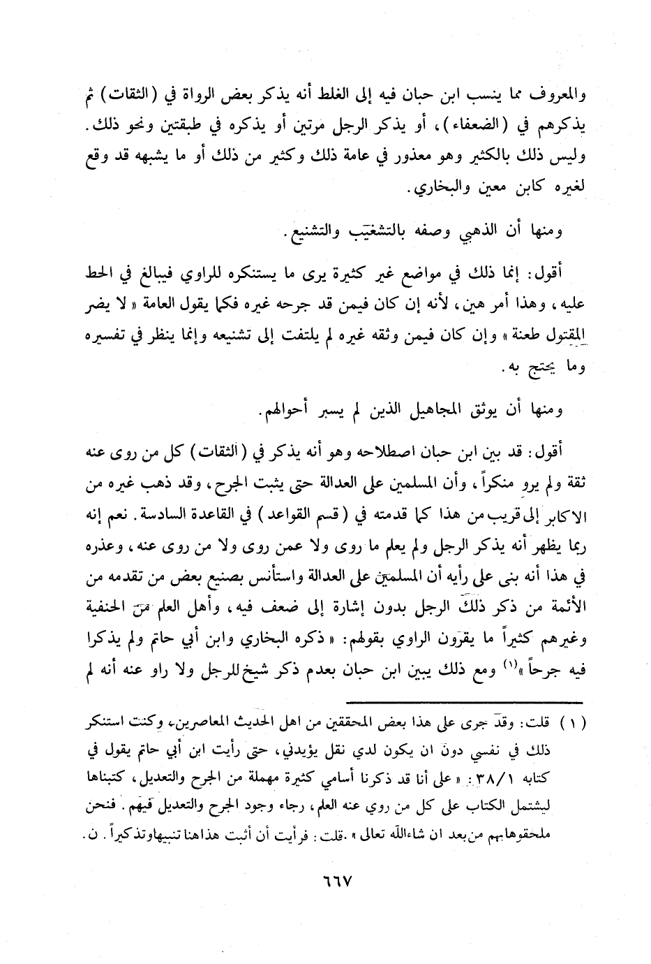 أقول: قد بين ابن حبان اصطلاحه وهو أنه يذكر في (الثقات) كل من روى عنه ثقة ولم يرومنكرا، وأن المسلمين على الدالة حتى يثبت الجرح، وقد ذهب غيره من الأكابر إلى قريب من هذا كما قدمته في (قسم القواعد) في القاعدة السادسة. نعم إنه ينى على رأيه أن المسلمين على العدالة واستأنس بصنيع بعض من تقدمه من الأئمة من ذكر ذلك الرجل بدون إشارة ضعف فيه، وأهل العلم من الحنفية وغيرهم كثيرا ما يقوون الراوي بقولهم: «ذكره البخاري وابن ابن حاتم ولم يذكرا فيه جرحا» (1) ومع ذلك يبين ابن حبان بعدم ذكر شيخ للرجل ولا راو عنه أنه لم