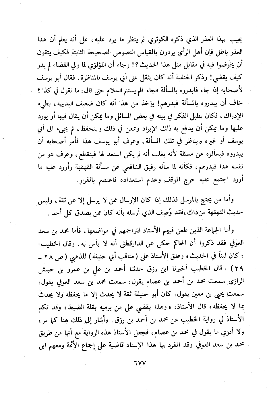وأما الجماعة الذين طعن فيهم الأستاذ فتراجمهم في مواضعها، فأما محمد بن سعد العوفي فقد ذكروا أن الحاكم حكى عن الدارقطني أنه لا باس به. وقال الخطيب: «كان لينا في الحديث» وعلق الأستاذ على مناقب أبي حنيفة) للذهبي ص 28 - 29 «قال الخطيب أخبرنا أبن رزق حدثنا أحمد بن علي بن عمرو بن حبيش الرازي سمعت محمد بن أحمد بن عصام يقول: سمعت محمد بن سعد ولا يحدث بما لا يحفظه» قال الأستاذ: «وهذا يقضي على من يرميه بقلة الضبط» وقد تكلم الأستاذ في الراوية الخطيب عن محمد بن أحمد بن رزق. وأشار إلى ذلك هنا كما مر ن ولا أدري ما يقول في محمد بن عصام ن فجعل الأستاذ هذه الرواية مع إنها من طريق محمد بن سعد العوفي وقد انفرد بها هذا الأستاذ قاضية على إجماع الأئمة ومعهم ابن