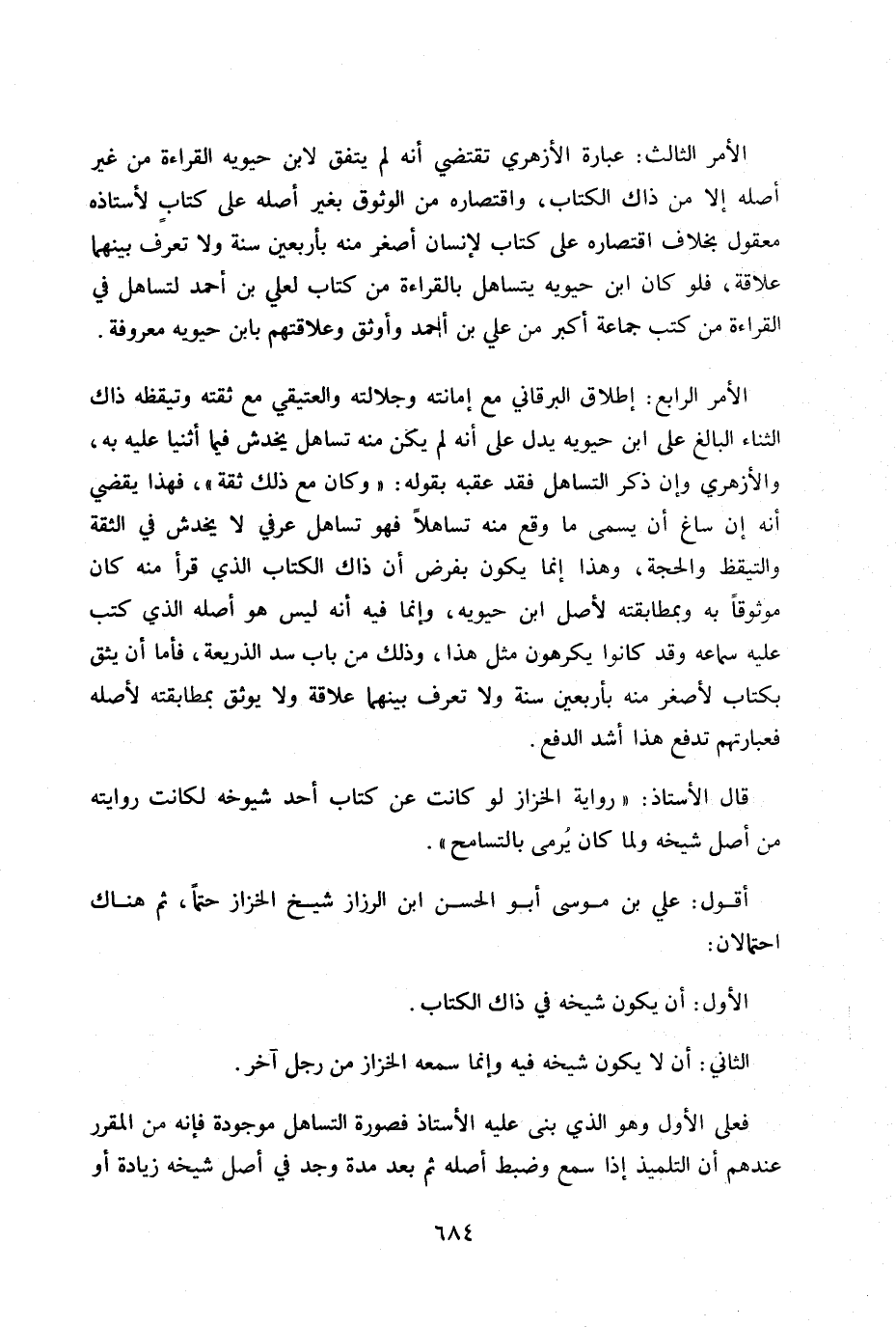 الأمر الثالث: عبارة الأزهري تقتضي أنه لم يتفق لابن حيويه القراءة من غير أصله إلا من ذاك الكتاب، واقتصاره الوثوق بغير أصله على كتاب لأستاذه معقول بخلاف اقتصاره على كتاب لإنسان أصغر منه بأربعين سنة ولا تعرف بينهما علاقة، فلو كان ابن حيويه يتساهل بالقراءة من كتاب لعلي بن أحمد لتساهل بالقراءة من كتب جماعة أكبر من علي بن أحمد