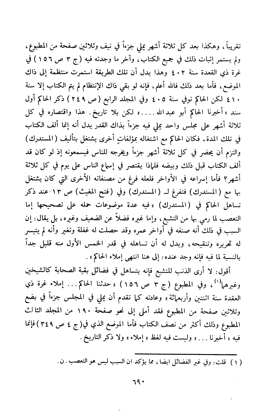 تقريبا، وهكذا بعد كل ثلاثة أشهر يملي جزءا في نيف وثلاثين صفحة من مطبوع، ولم يستمر إثبات ذلك في جميع الكتب، وآخر ما وجدته فيه ج 3 ص 156 في غرة ذي القعدة سنة 402 وهذا يدل أن تلك الطريقة استمرت منتظمة إلى ذاك الموضع، فأما بعد ذلك فلا أعلم، فإنه لو بقي ذاك الانتظام لم يتم الكتاب ألا سنة 410 لكن الحاكم توفي سنة 405 وفي المجلد الرابع ص 249 ذكر الحاكم أول سند «أخبرنا الحاكم أبو عبد الله ... » لكنه بلا تاريخ. هذا واقتصاره في كل ثلاثة أشهر على مجلس واحد يملي فيه جزء بذاك القدر يدل أنه أنما ألف الكتاب في تلك المدة، فكان الحكام مع اشتغاله بمؤلفات أخرى يشتغل بتأليف «المستدرك» والتزام أن يحضر في كل ثلاثة أشهر جزء ويخرجه للناس فيسمعونه إذا لو كان قد ألف الكتاب قبل ذلك وبيضه فلماذا يقتصر في أسماع الناس على يوم في كل ثلاثة أشهر؟ فأما إسراعه في أواخر فلعله فرغ من مصنفاته الأخرى التي كان يشتغل بها مع «المستدرك» فتفرغ لـ «المستدرك» وفي «فتح المغيث» ص 13 عند ذكر تساهل الحاكم في المستدرك «فيه عدة موضوعات حمله على تصحيحها إما التعصب لما رمي به من التشيع، وإما غيره فضلا عن الضعيف وغيره، بل يقال: أن السبب في ذلك أنه صنفه في أواخر عمره وقد حصلت له غفلة وتغير وأنه لم يتيسر له تحريره وتنقيحه، ويدل له أن تساهله في قدر الخمس الأول منه قليل جدا لما فيه فأنه وجد عنده: إلى هنا انتهى إملاء الحاكم» .