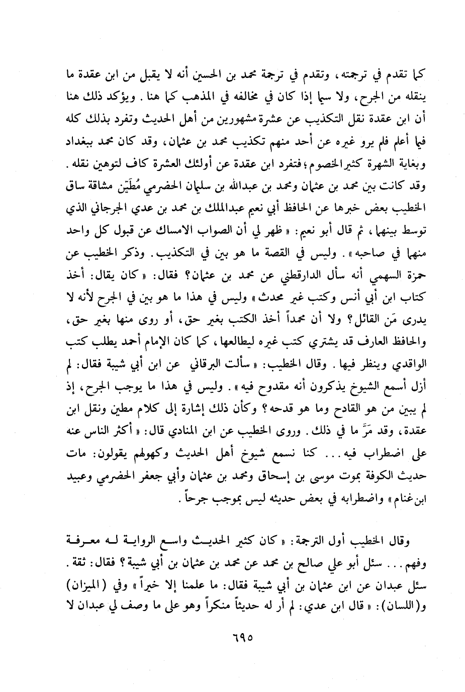 كما تقدم في ترجمته، وتقدم في ترجمة محمد بن الحسين أنه لا يقبل من ابن عقدة ما ينقله من الجرح، ولا سيما إذا كان في مخالفة في المذهب كما هنا. ويؤكد ذلك هنا أن ابن عقدة نقل التكذيب عن عشرة مشهورين من أهل الحديث وتفرد بذلك كله فيما اعلم فلم يرو غيره عن أحد منهم تكذيب محمد بن عثمان ن وقد كان محمد ببغداد وبغاية الشهرة كثير الخصوم فتفرد ابن عقدة عن أولئك العشرة كاف لتوهين نقله. وقد كانت بين محمد بن عثمان ومحمد بن عبد الله بن سليمان الحضرمي مطين مشاقة ساق الخطيب بعض خبرها عن الحافظ أبي نعيم عبد الملك بن محمد بن عدي الجرجاني الذي توسط بينهما، ثم قال أبو نعيم: «طهر لي أن الصواب الإمساك عن قبول كل واحد منهما في صاحبه» . وليس في القصة ما هو بين في التكذيب. وذكر الخطيب عن حمزة السهمي أنه سأل الدارقطني عن محمد بن عثمان؟ فقال: «كان يقال: أخذ كتاب ابن أبي أنس وكتب غير محدث» وليس في هذا ما هو بين في الجرح لأنه لا يدري من القائل؟ ولا أن محمدا أخذ الكتب بغير حق، أو روى منها بغير حق، والحافظ العرف قد يشتري كتب غيره ليطالعها، كما كان الإمام أحمد يطلب كتب الواقدي وينظر فيها. وقال الخطيب: «سألت البرقاني عن ابن أبي شيبة فقال: لم أزل اسمع الشيوخ يذكرون أنه مقدوح فيه» . وليس في هذا ما يوجب الجرح، غذ لم يبين من هو القادح وما هو قدحه؟ وكأن ذلك إشارة إلى كلام مطين ونقل ابن عقدة، وقد مر ما في ذلك. وروى الخطيب عن ابن المنادي قال: «أكثر الناس عنه على اضطراب فيه ... كنا نسمع شيوخ أهل الحديث وكهولهم يقولون: مات حديث الكوفة بموت موسى بن إسحاق ومحمد بن عثمان واني جعفر الحضرمي وعبيد بن غنام» واضطرابه في بعض حديثه ليس بموجب جرحا.