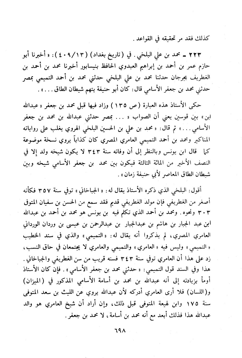 حكى الأستاذ هذه العبارة ص 135 وزاد فيها قبل بن محمد بن جعفر «عبد الله بن» بين قوسين يعني أن الصواب « ... بمصر حدثني عبد الله بن محمد بن جعفر الأسامي ... » ثم قال: «محمد بن علي بن الحسن البلخي الهروي يغلب على رواياته المناكير ومحمد بن أحمد التميمي العامري المصري كان كذابا يروي نسخة موضوعة كما قال ابن يونس وبالنظر إلى أن وفاته سنة 343 لا يكون شيخه ولد إلا في النصف الأخير من المائة الثالثة فيكون بين محمد ابن جعفر الأسامي شيخه وبين شيطان الطاق المعاصر لأبي حنيفة زمان» .