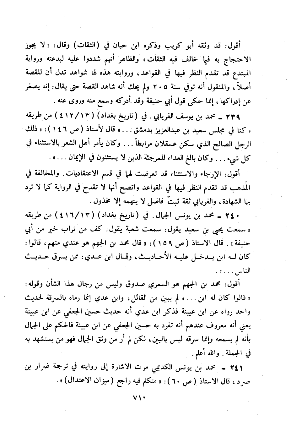 239- محمد بن يوسف الفريابي. في (تاريخ بغداد) 13 / 412 من طريقه «كنا في مجلس سعيد بن عبد العزيز بدمشق ... » قال الأستاذ ص 146: «ذلك الرجل الصالح الذي سكن عسقلان مرابطا ... وكان يأمر أهل الثغر بالاستثناء في كل شيء ... وكان بالغ العداء للمرجئة الذين لا يستثنون في الإيمان ... »