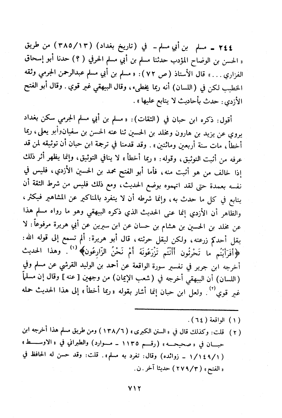 أقول: ذكره ابن حبان في (الثقات) : «مسلم بن أبي مسلم الجرمي سكن بغداد يروي عن يزيد بن هارون ومخلد بن الحسين ثنا عنه الحسن بن سفيان وأبو يعلى، ربما أخطأ، مات سنة أربعين ومائتين» . وقد قدمنا في ترجمة ابن حبان أن توثيقه، لمن قد عرفه من أثبت التوثيق، وقوله «ربما أخطأ» لا ينافي التوثيق، وإنما يظهر اثر ذلك إذا خالف من هو أثبت منه، فآما أبو الفتح محمد بن الحسين الأزدي، فليس في نفسه كل ما حدث به، وإنما شرطه أن لا يتفرد بالمناكير عن المشاهير فيكثر، والظاهر أن الأزدي إنما عني الحديث الذي ذكره البيهقي وهو ما رواه مسلم هذا عن مخلد بن الحسين عن هشام بن حسان عن ابن سيرين عن أبي هريرة مرفوعا: لا يقل أحدكم زرعته، ولكن ليقل حرثته، قال أبو هريرة: ألم تسمع إلى قول الله «أَفَرَأَيْتُمْ مَا تَحْرُثُونَ. أَأَنْتُمْ تَزْرَعُونَهُ أَمْ نَحْنُ الزَّارِعُونَ) (الواقعة:64) » . وهذا الحديث أخرجه ابن جرير في تفسير سورة الواقعة عن أحمد بن الوليد القرشي عن مسلم وفي (اللسان) أن البيهقي أخرجه في (شعب الأيمان) من وجهين «عنه» وقال إن مسلما غير قوي (1) . ولعل ابن حبان إنما أشار بقوله «ربما أخطأ» إلى هذا الحديث حمله