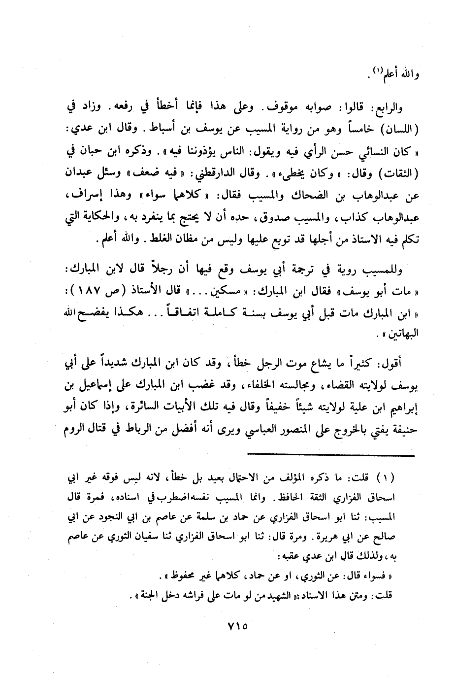 وللمسيب رواية في ترجمة أبي يوسف وقع فيها أن رجلا قال لابن المبارك: «مات أبو يوسف» فقال ابن المبارك: «مسكين ... » قال الأستاذ ص 187: «ابن المبارك مات قبل أبي يوسف بسنة كاملة اتفاقا ... هكذا يفضح الله البهاتين» .