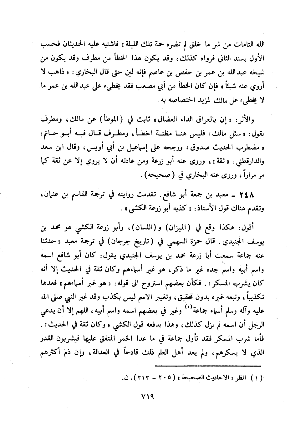 الله التامات من شر ما خلق لم تضره حمة تلك الليلة» فاشتبه عليه الحديثان فحسب الأول بسند الثاني فرواه كذلك، وقد يكون هذا الخطأ من مطرف وقد يكون من شيخه عبد الله بن عمر بن حفص بن عاصم فإنه لين حتى قال البخاري: «ذاهب لا أروي عنه شيئا» فإن كان الخطأ من أبي مصعب فقد يخطئ على عبد الله بن عمر ما لا يخطئ على مالك لمزيد اختصاصه به.