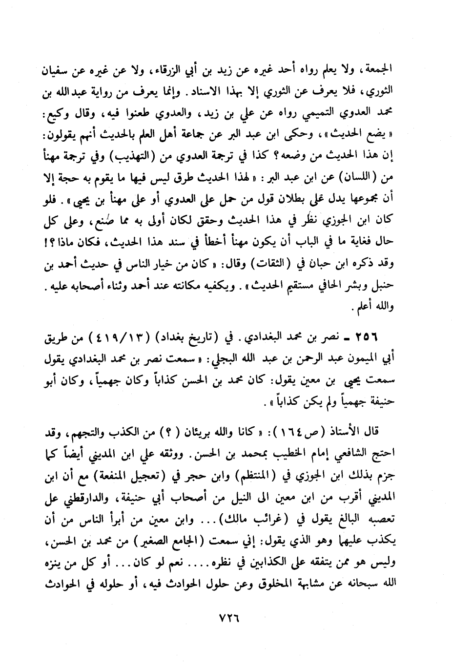 256- نصر بن محمد البغدادي. في (تاريخ بغداد) 13 / 419 من طريق أبي الميمون عبد الرحمن بن عبد الله البجلي: «سمعت نصر بن محمد البغدادي يقول سمعت يحيى ابن معين يقول: كان محمد بن الحسن كذابا وكان جهميا، وكان أبو حنيفة جهميا ولم يكن كذابا» .